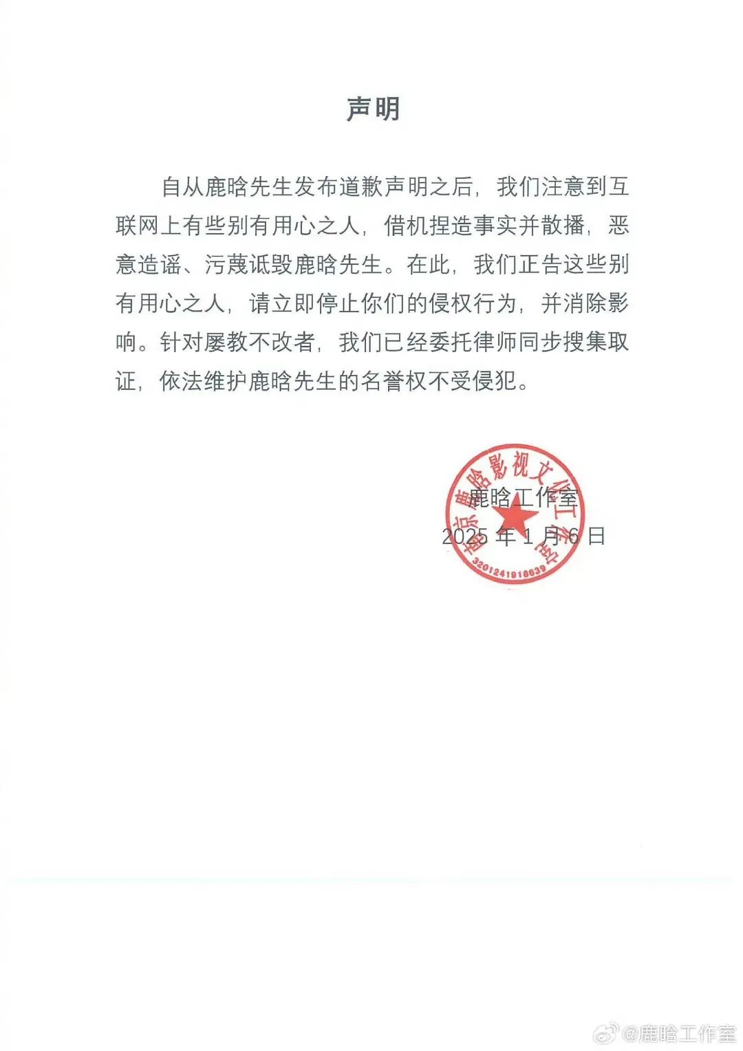 1月6日17:46,鹿晗工作室再次回应,发表声明称道歉声明发布后,互联网别有用心之人,借机捏造事实并散播,恶意造谣、污蔑诋毁鹿晗,工作室正告其停止侵权行为,针对屡教不改者将依法维权。
