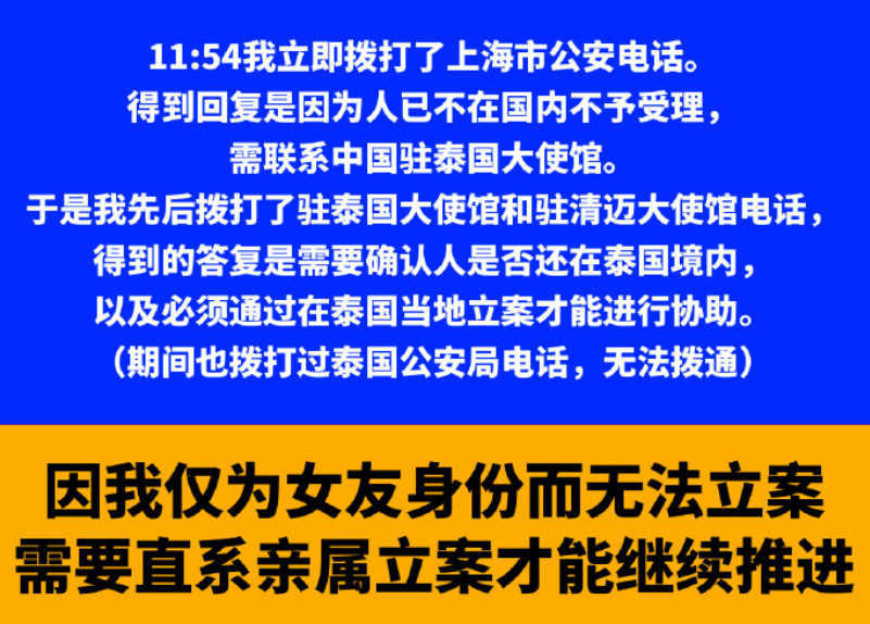 警方表示:1、人不在国内不予受理,需联系中国驻泰国大使馆 2、女友身份无法立案,需要直系亲属才能推进