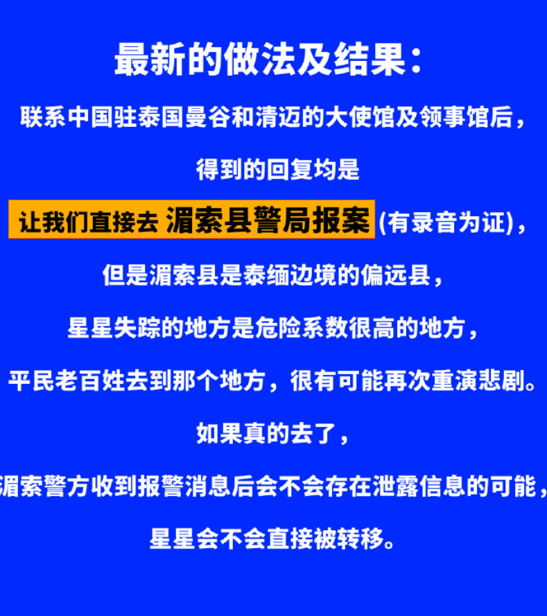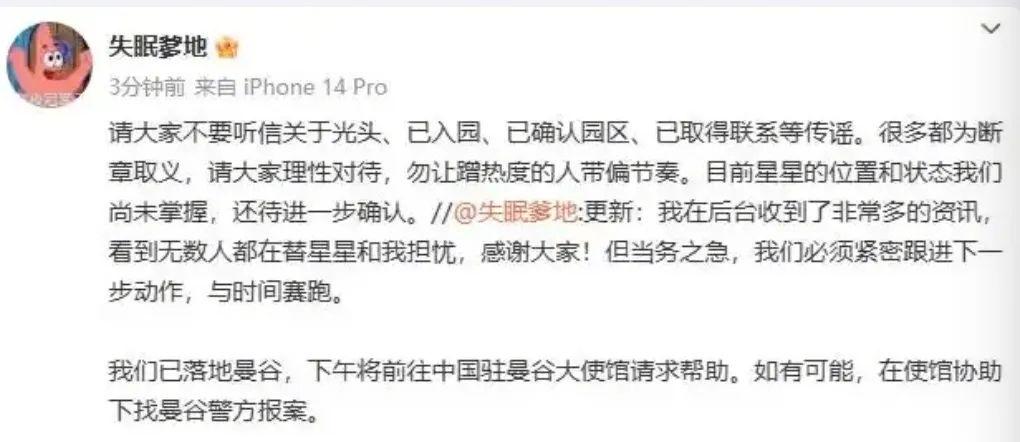 昨晚,自称是演员星星女友嘉嘉的微博用户@失眠爹地 发布了一条求助信息,说星星前往泰国进组拍戏,却在1月3日中午12时在泰缅边境失联。