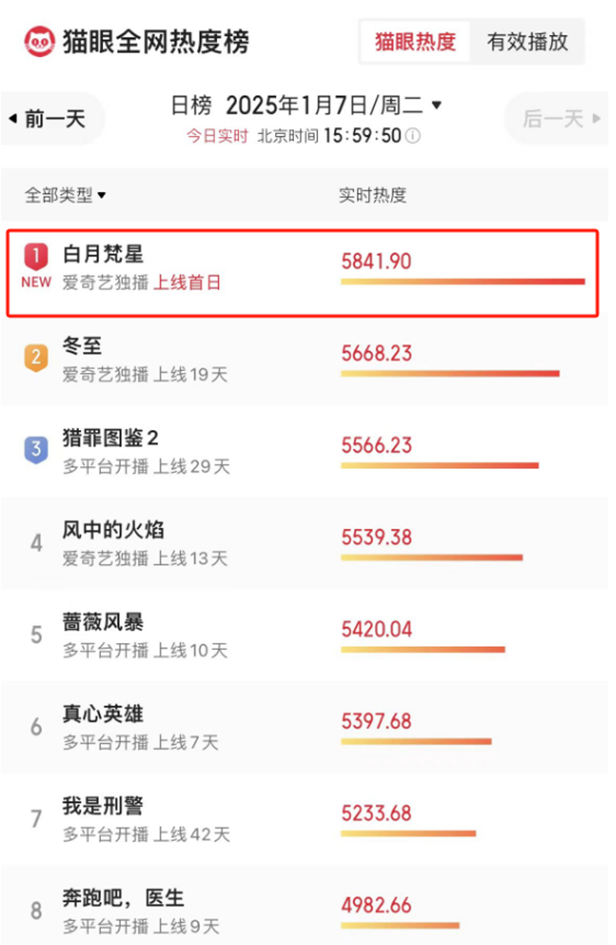 让观众期待已久的《白月樊星》上线桃厂,首播仅4个小时便拿下全网热度冠军,热度势如破竹,看来2025年的第一部古装爆款,就是它了!