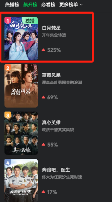 《白月梵星》登陆桃家,首日一口气放出5集,直接斩获飙升榜第一。