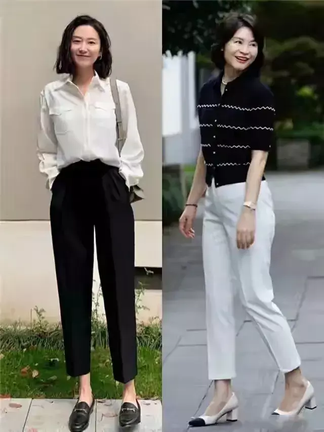我们也可以选择最为基础的颜色来搭配黑白色彩,最为经典,一件白色的衬衫搭配上黑色的圆管裤,或者是黑色的针织开衫搭配上白色的烟管裤,这样的穿搭,四五十岁的女性穿的也很好看,年轻貌美又不挑人。