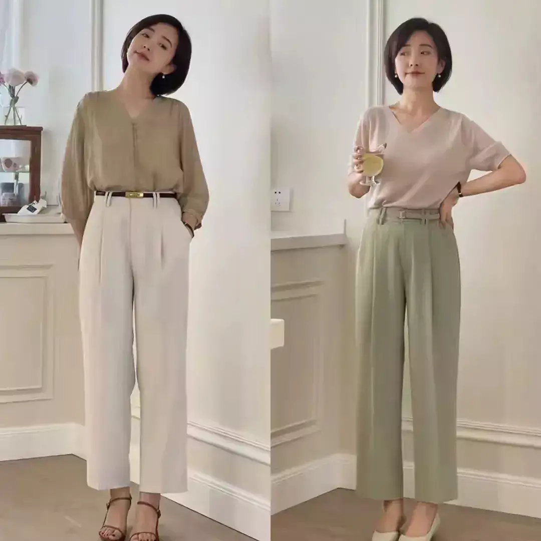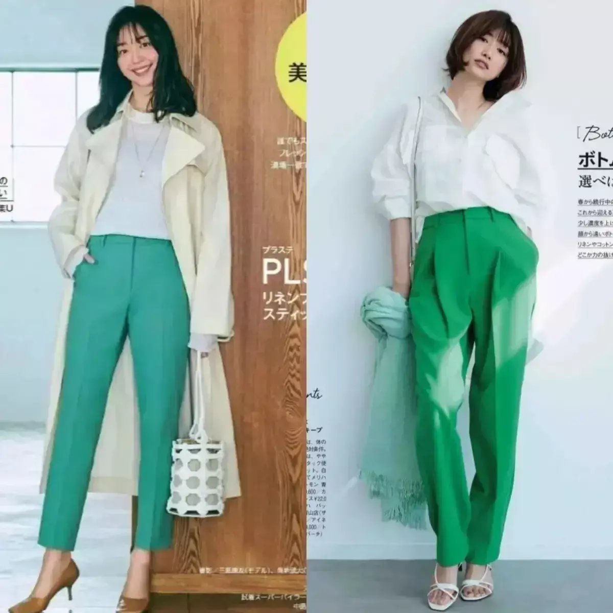 首先是面料一定要挺括有型,材质上看起来要有光泽感,手感要好,例如下面这两条浅绿色烟管裤和深绿色的九分烟管裤,搭配上白色的衬衫或者是T恤加风衣,使得穿搭者都显得很干练。