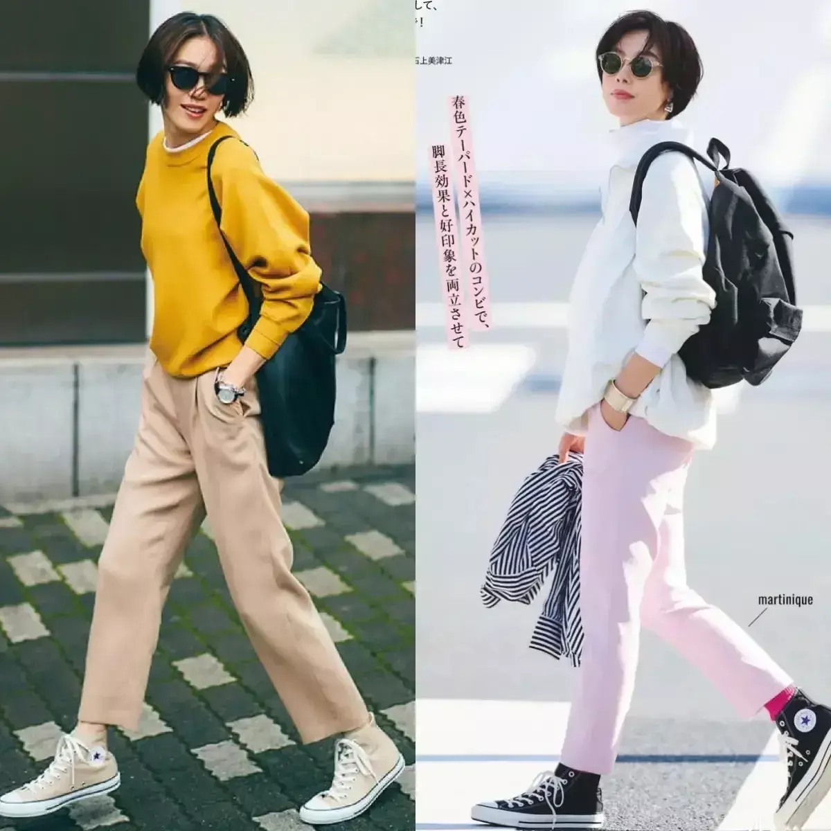 喜欢休闲的穿搭风格,千万不要错过帆布鞋,帆布鞋穿起来更有少女元素,再搭上低饱和度的烟管裤,走起路来自带风。