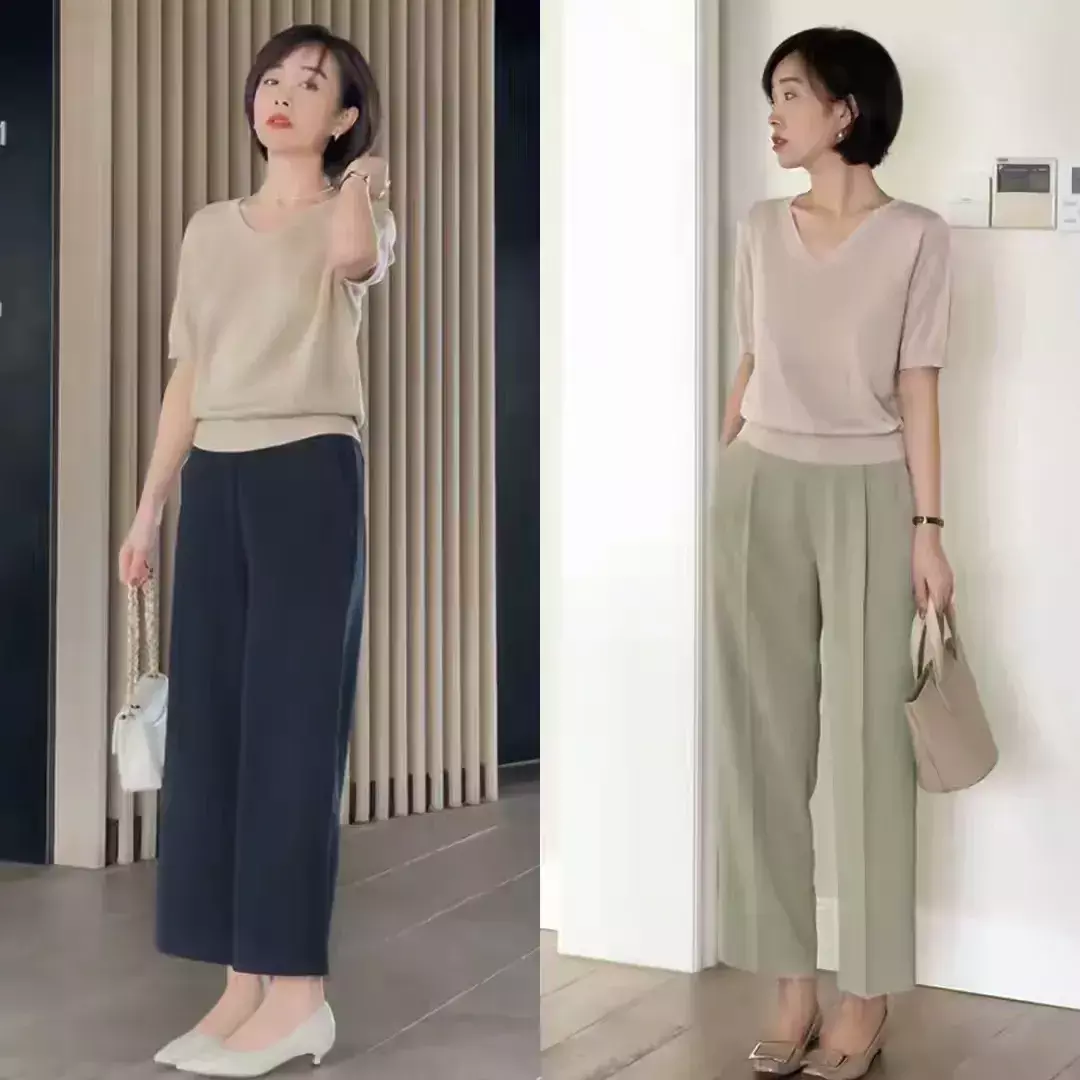 可以像下面这位博主一样,选择一件新色的薄款针织短袖或者是浅粉色的V领针织短袖上衣,搭配上烟管裤,脚踩浅口的低跟鞋,轻松展现出女性的魅力,温柔优雅又大方。