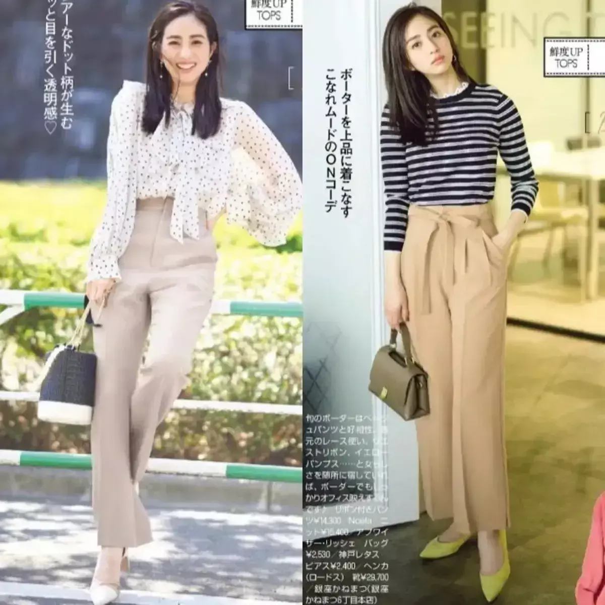 例如下面这两套穿衣示范分别是用波点的雪纺衬衫搭配上杏色的烟管裤,或者是黑白条纹的针织上衣搭配上卡其色的烟管裤,轻松松穿出气质感。