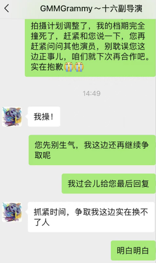 其实从聊天记录来看,我相信王星开始是有过质疑的,也表示了这次就不合作了,但没成想这个演员统筹一下就急了,最后王星还是答应了下来。