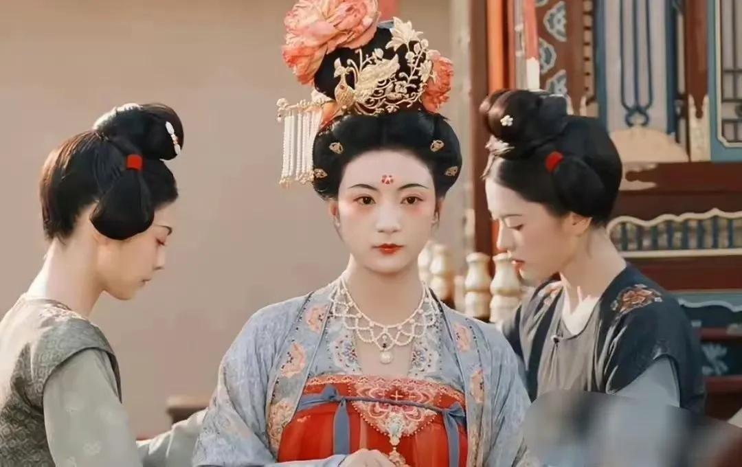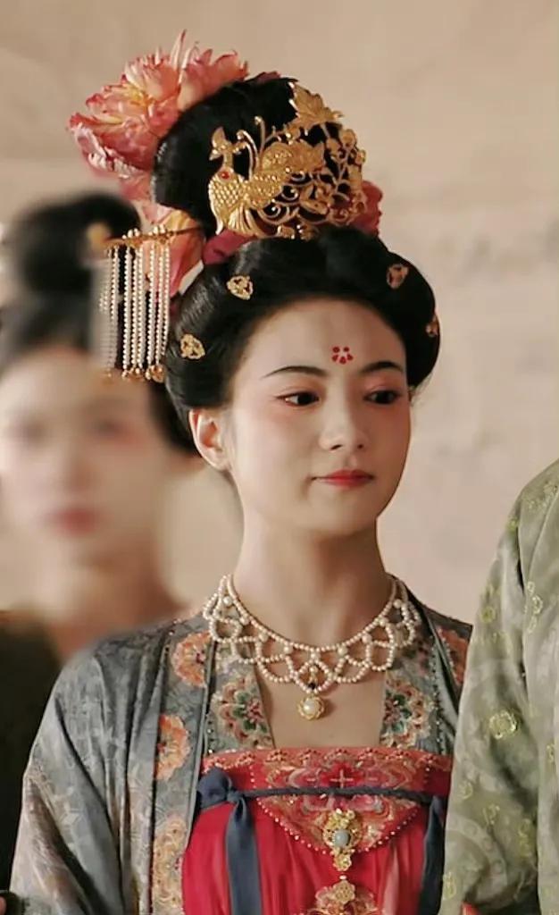 这次是扮唐妆,得脸盘圆,丰腴些,才能撑起繁重的高鬟危鬓,体态有玲珑曲线,才能驾驭起襦裙披帛。