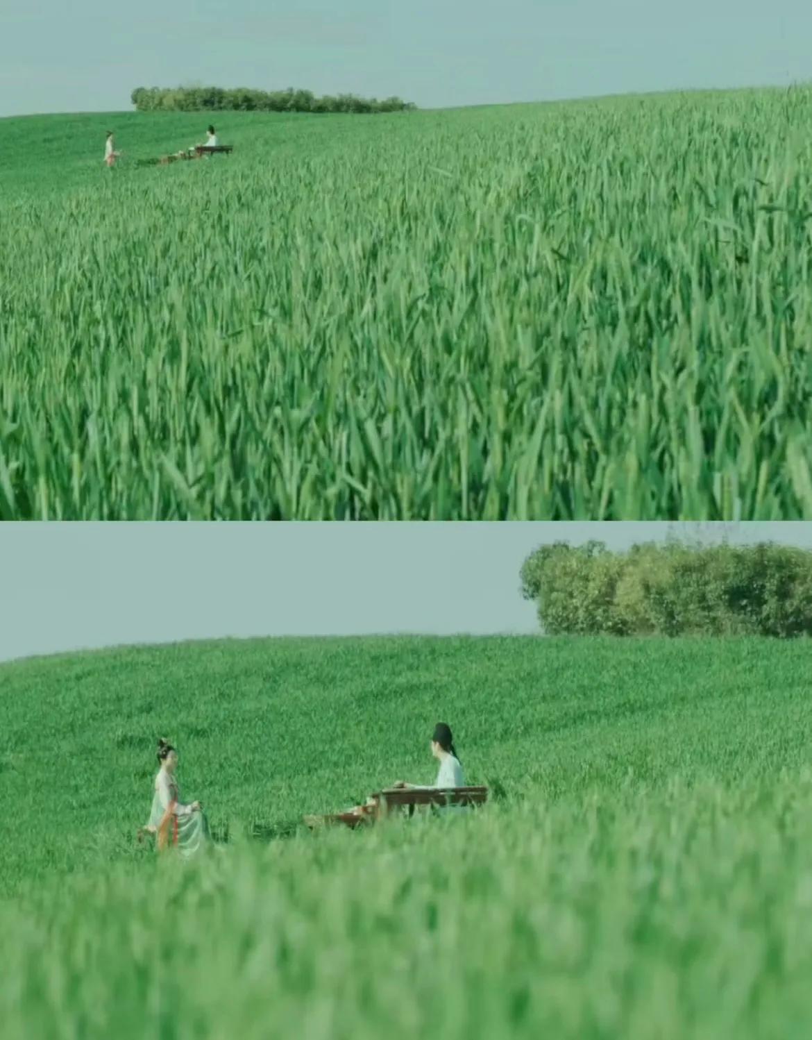 这部他继续发挥优势,就用大自然置景,非常纯粹,也没把实景拍得像棚拍,像刘畅幼贞田间谈情这一幕,天空湛蓝、芳草鲜美,时而传来群鸟啼声,壮阔而静谧。