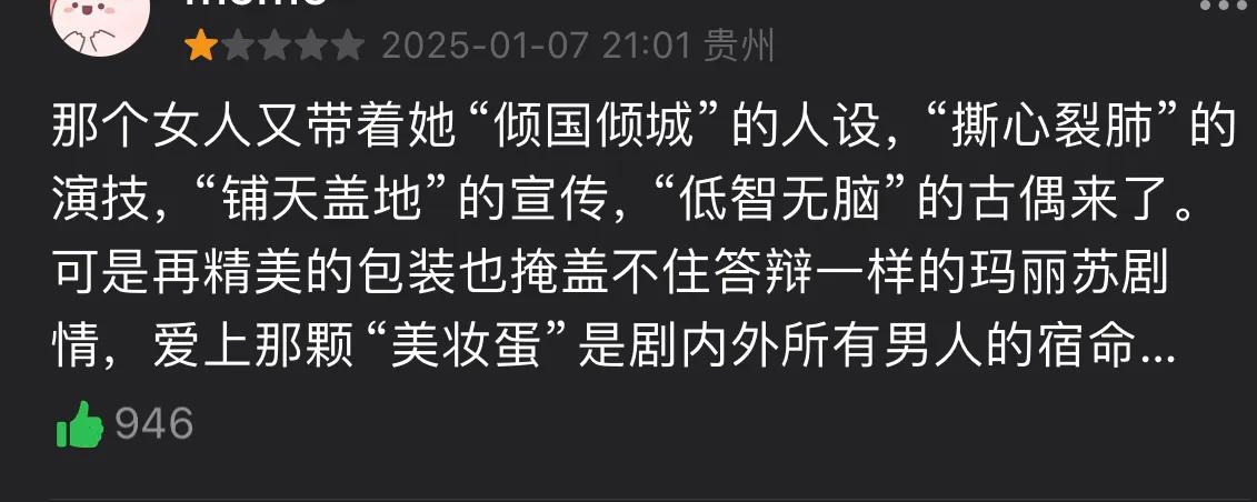 “那个女人又带着倾国倾城的人设,撕心裂肺的演技,铺天盖地的宣传来侵蚀观众的眼球,绑架观众的审美…”