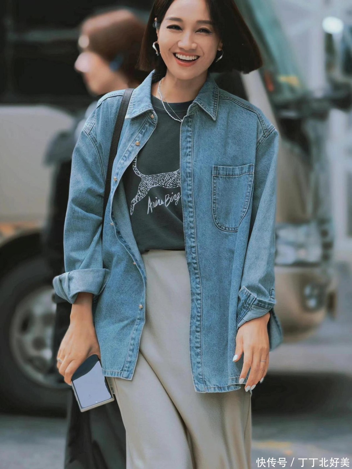 牛仔外套搭配灰色长裙,朱丹将这一套造型穿出了知性的美感。虽然不能做到眼前一亮,却高知感十足,对于上了年纪的女性来说,这样的造型才能突出气韵。