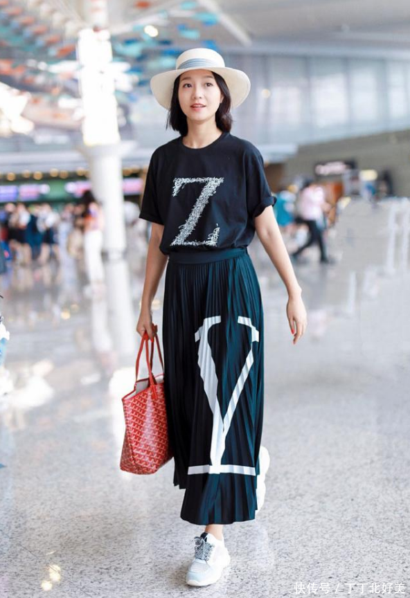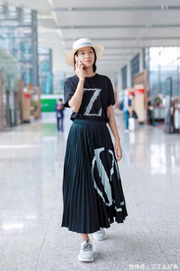 不过,单穿一整套黑色裙子,在夏天也会显得过于沉闷单调。所以朱丹的上衣和裙子上都带了明显的白色字母,在造型上起到了让人眼前一亮的效果。像T恤和半身裙的搭配,也是日常穿搭里很常见的一种,浅色的搭配会更具小清新的色彩,深色自然而然看起来也会更加成熟有韵味。