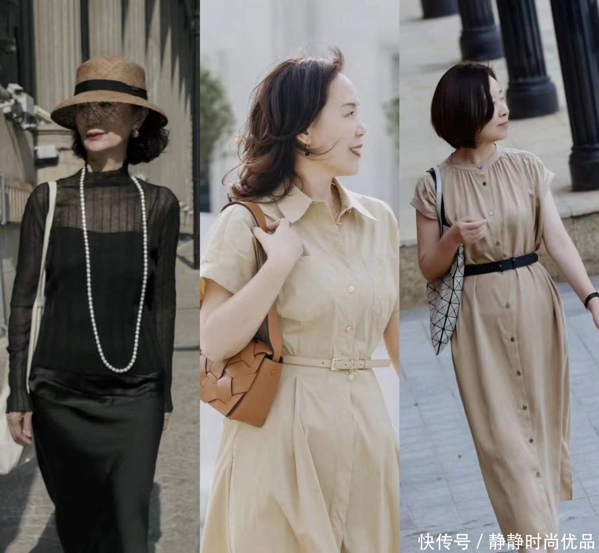 大龄女性不用急着挑选款式夸张的连衣裙,基础色裙装可以满足她们的需求。例如黑色、卡其色等连衣裙都是可以持续使用的单品,驾驭难度一点都不高。