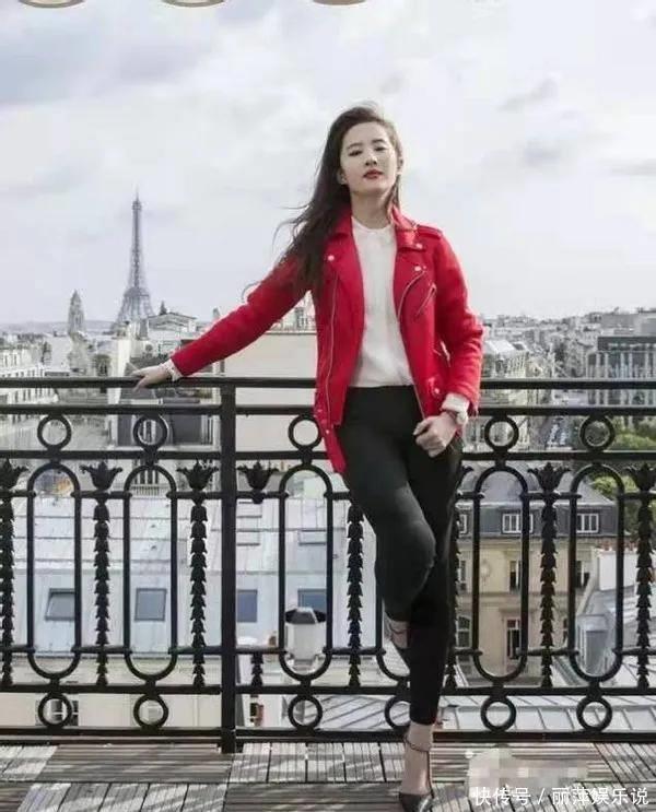 刘亦菲的穿搭充满了都市女性的优雅与活力。她身着一件红色夹克,色彩鲜艳且充满热情,搭配黑色裤子和高跟鞋,凸显出她修长的身材。头发自然披肩,增添了几分随性。她站在阳台上,与远处的埃菲尔铁塔相映成趣,整体造型既时尚又迷人。