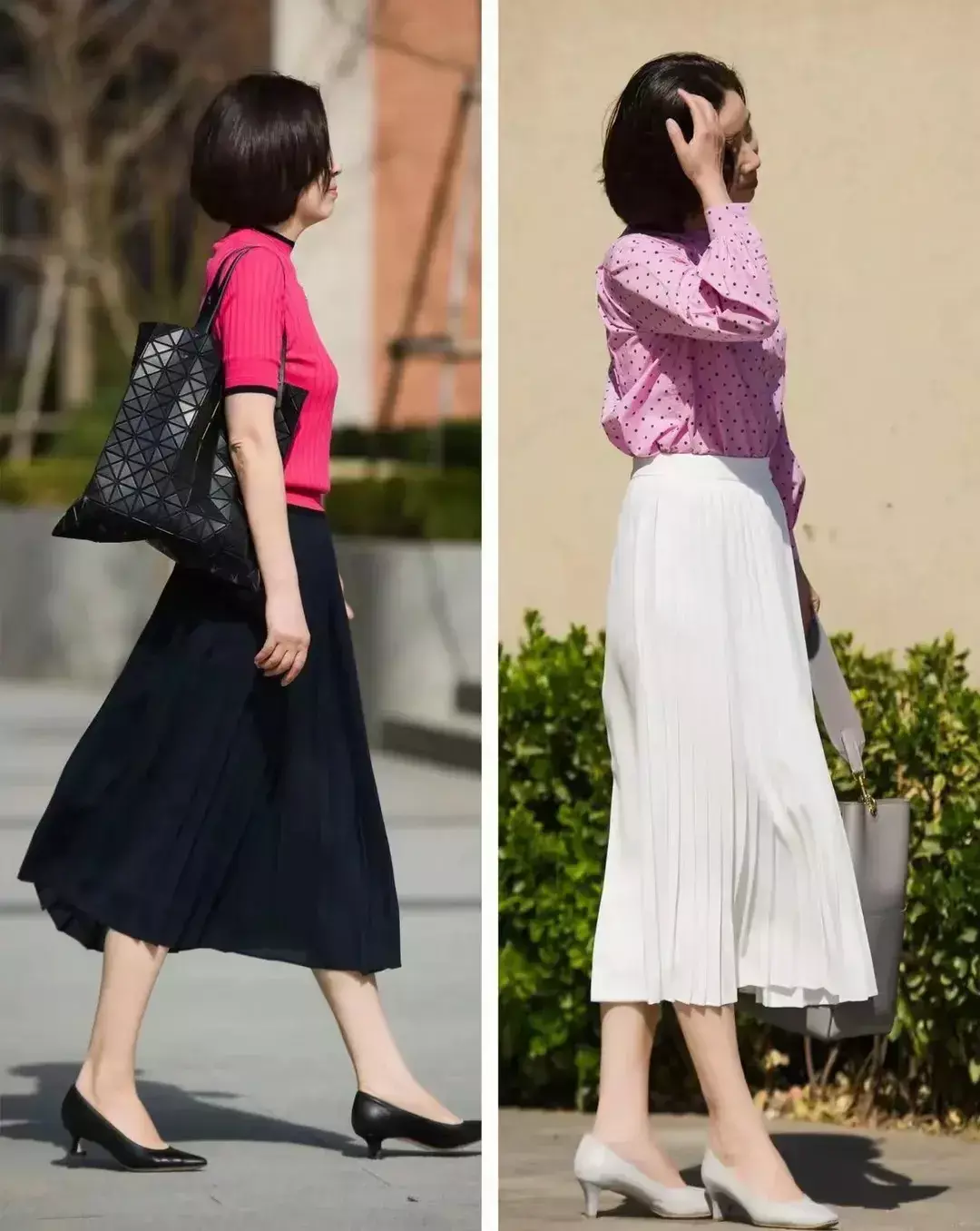 例如,黑色的短袖上衣搭配上灰棕色的百褶半身裙,裙子的长度到小腿肚的位置,露出脚踝,脚上踩着一双高跟鞋,拉伸腿部线条,让你的腿型更修长。