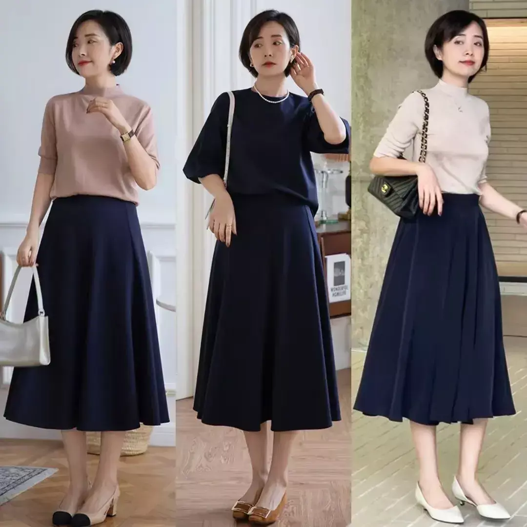 因为针织上衣天生就有温柔感,穿在身上之后能散发出女人的气质和女人味,例如下面这三件都属于薄款的针织上衣,透气性也很好,贴身穿都没有问题,和藏蓝色的a字半身裙进行搭配就够了。