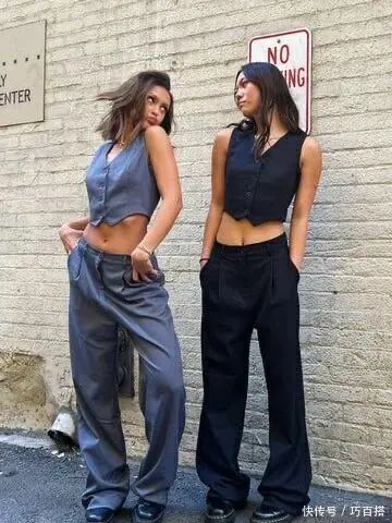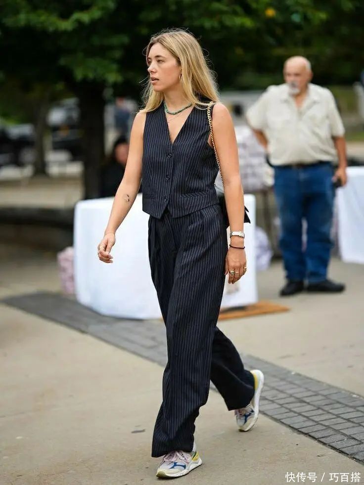 西装马甲还有一大好处就是既可以搭配裤装又可以搭配裙装,在裤装的选择上,阔腿西装裤、窄版西装裤、高腰牛仔裤都能与之搭配。