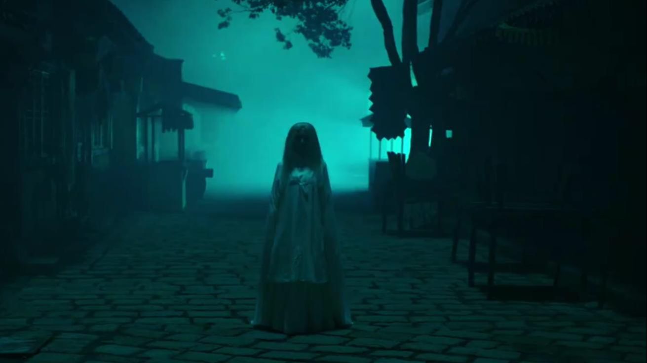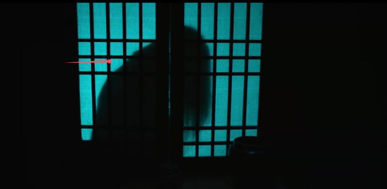 预告中,第一幕就让人血脉喷张,虽然隔着一扇门,但是蓝色的背景中,能看到有一个人披头散发,垂着自己的头,慢慢地从外面飘过。