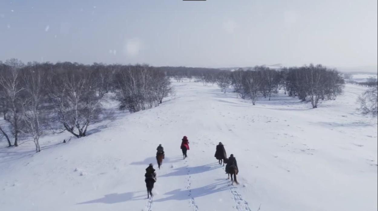然而除了这些镜头之外,满屏的大火还有爆炸也是同样震撼,在一片大雪地的纯白背景中,一群人骑着马飞驰,飘雪更是十分的浪漫,红色的披肩更是非常搭。