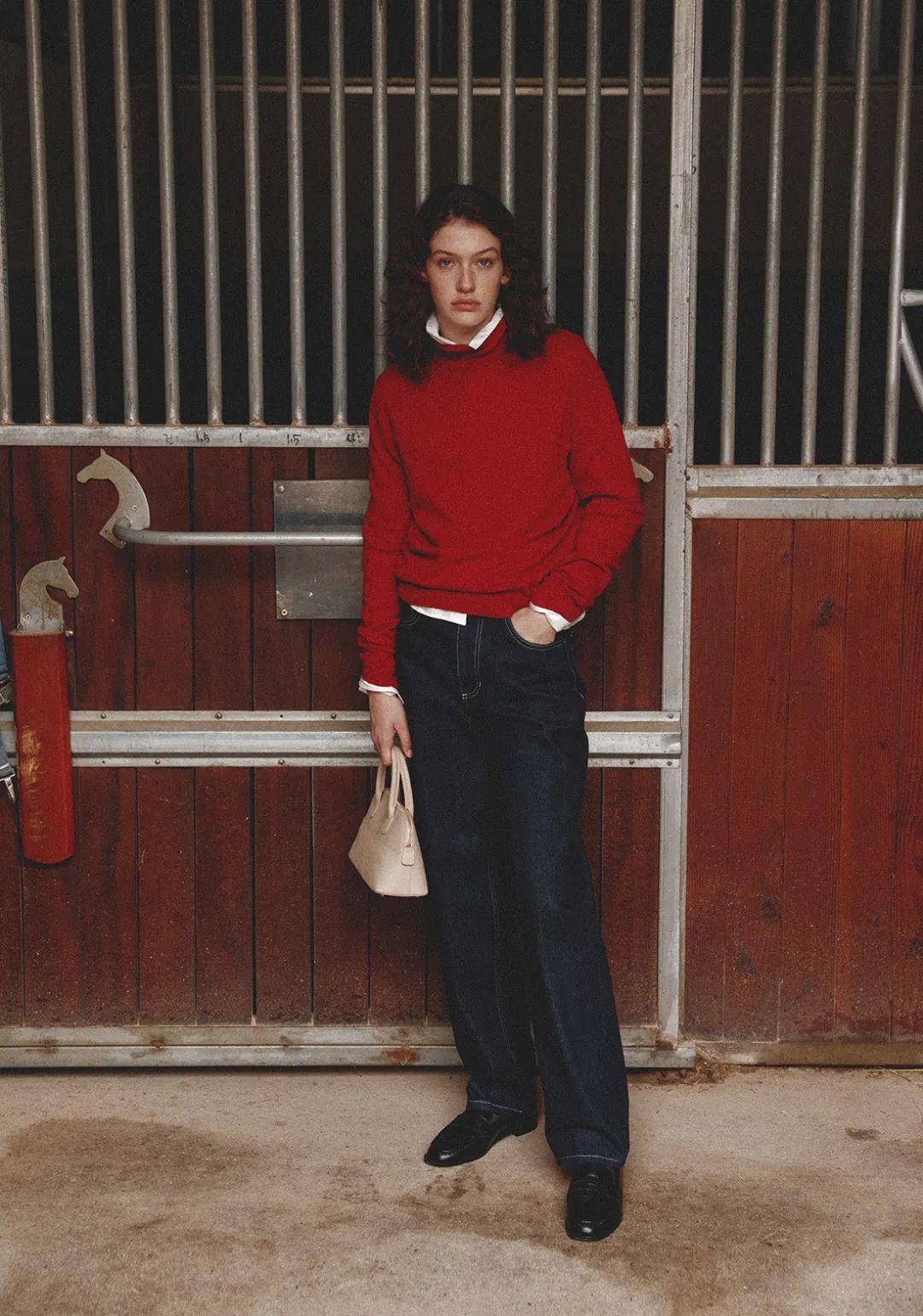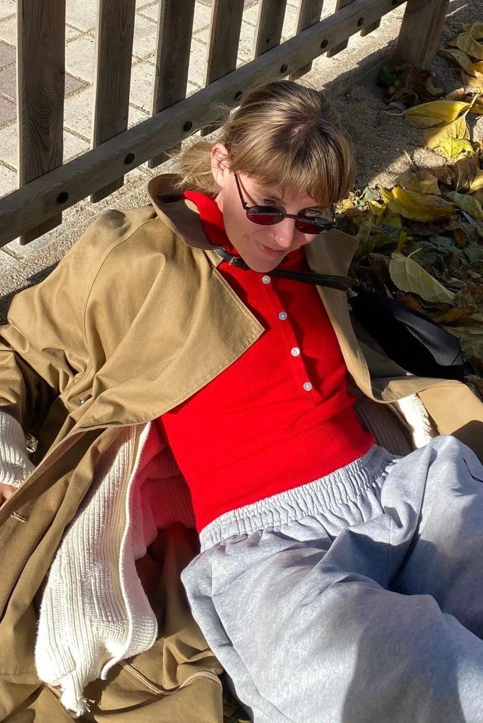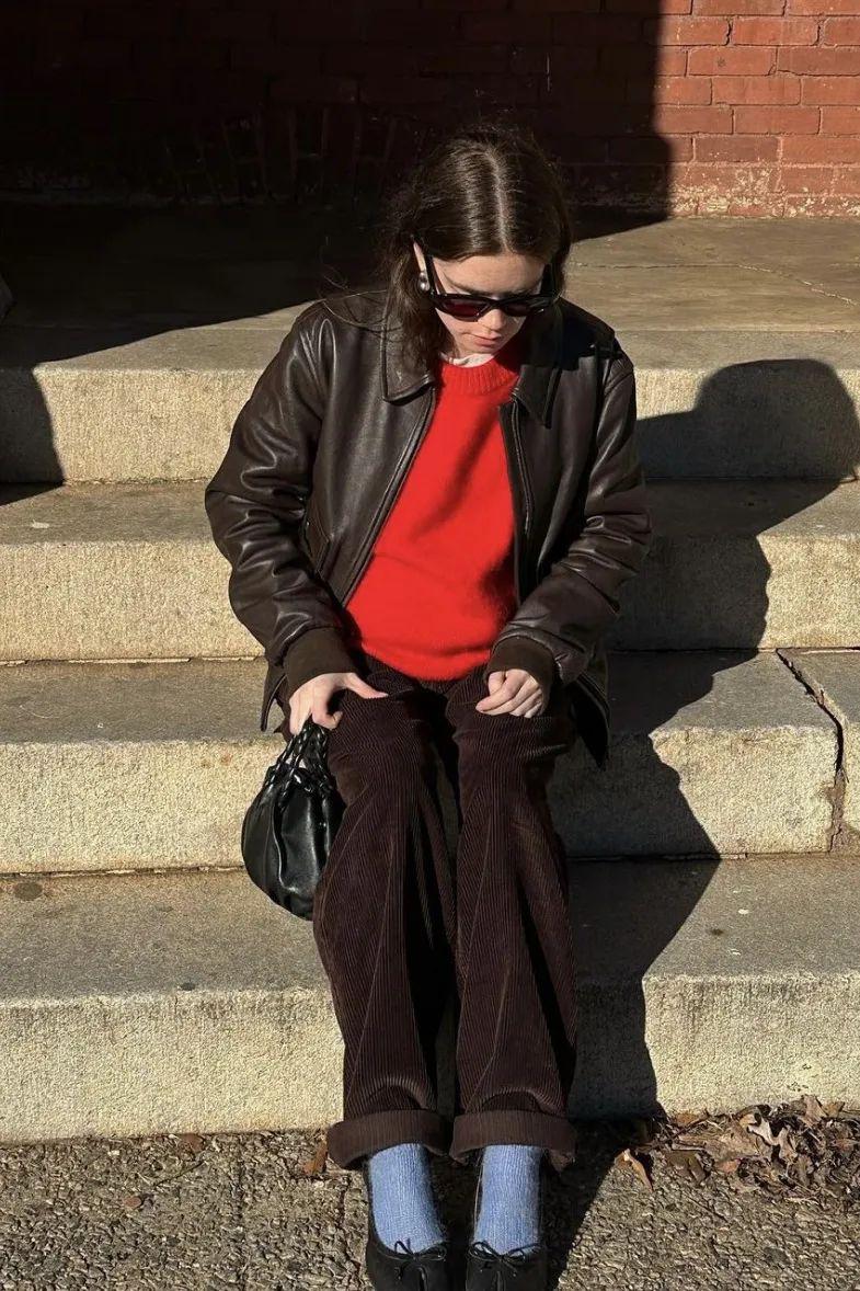 内搭红色因为有了外套的遮挡,这种少量的露出面积,反而适合大胆一些,挑战一些高饱和度的红,会更加别致高调。