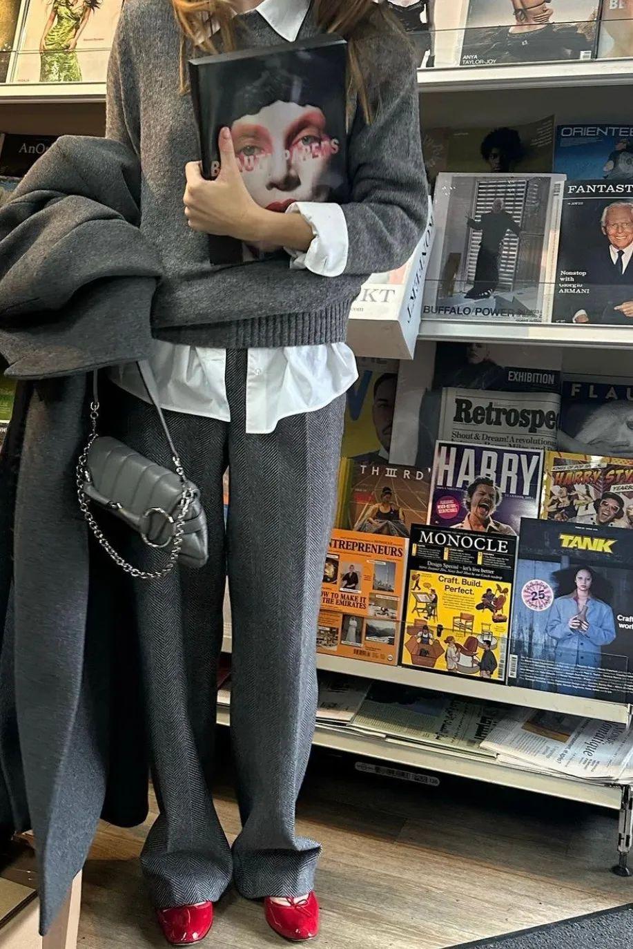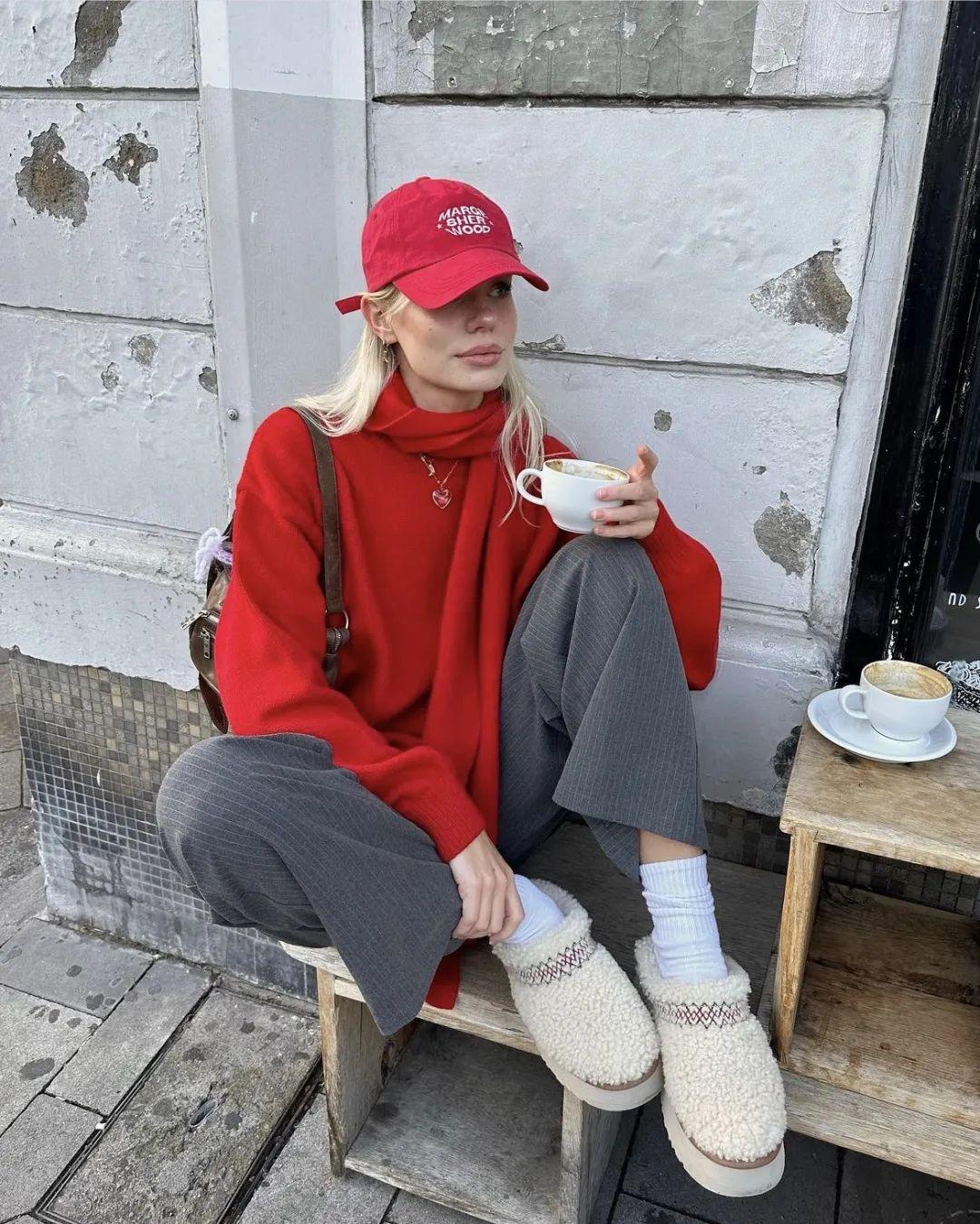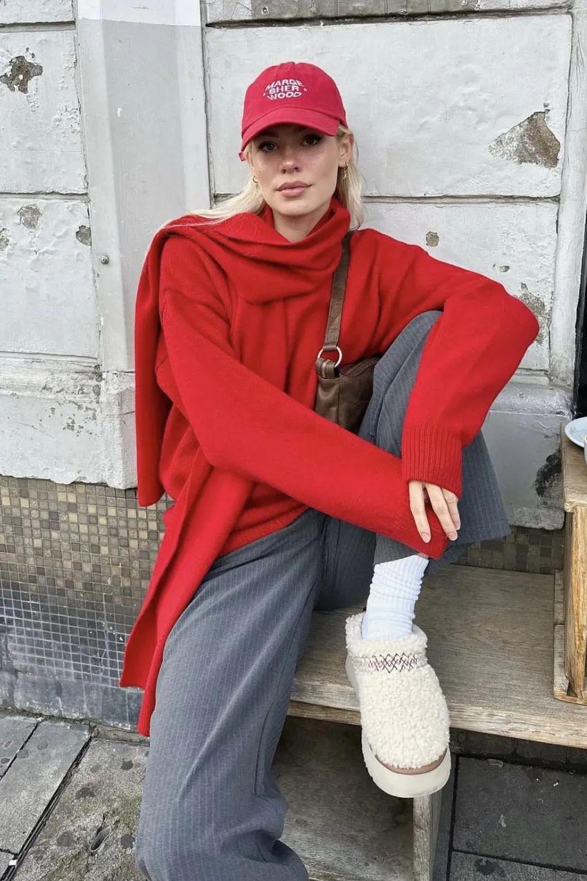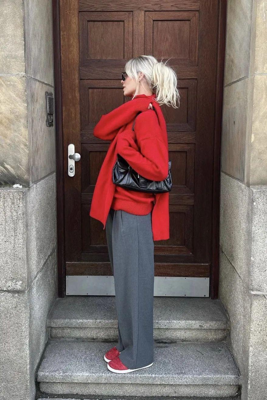 当然一件红色毛衣是离不开的衣橱必备款,只不过在搭配上,今年的灰色系是爆款组合。