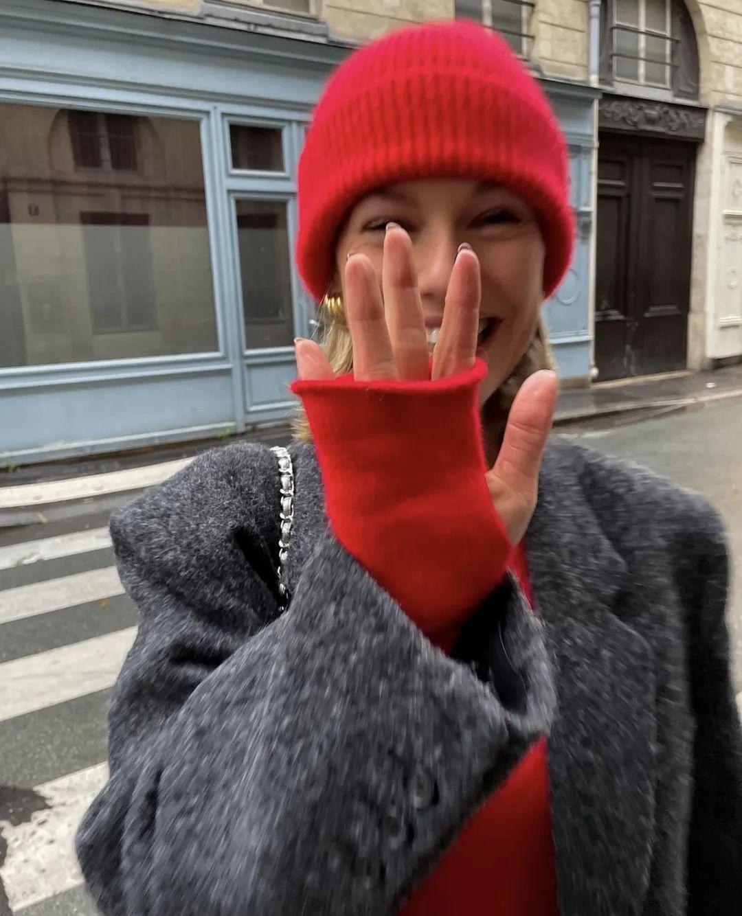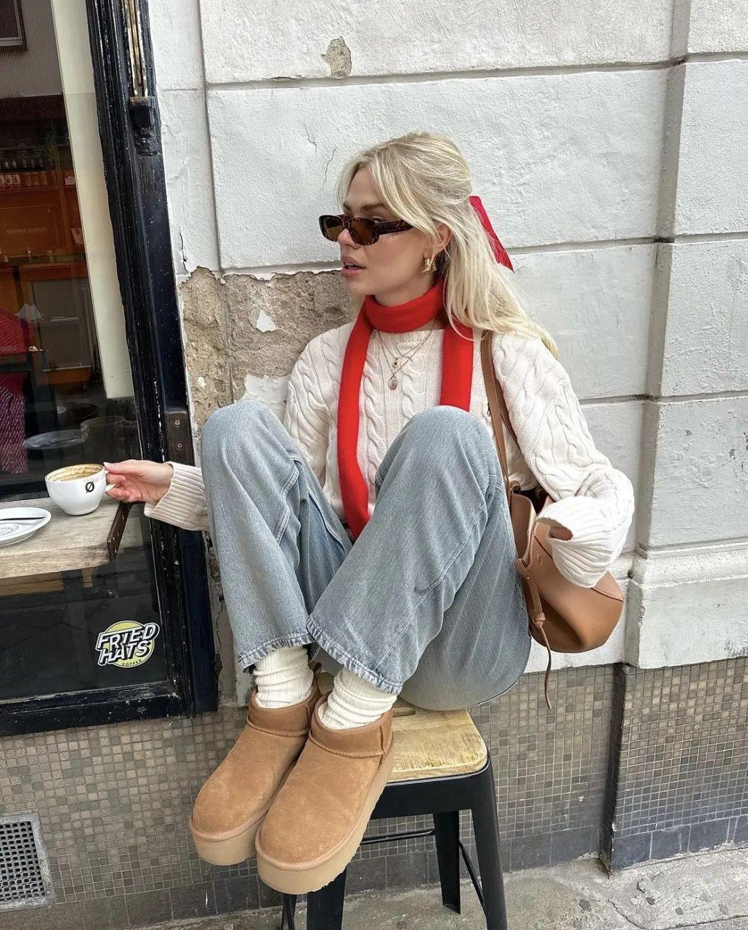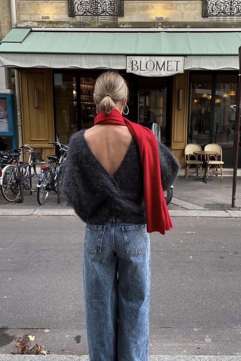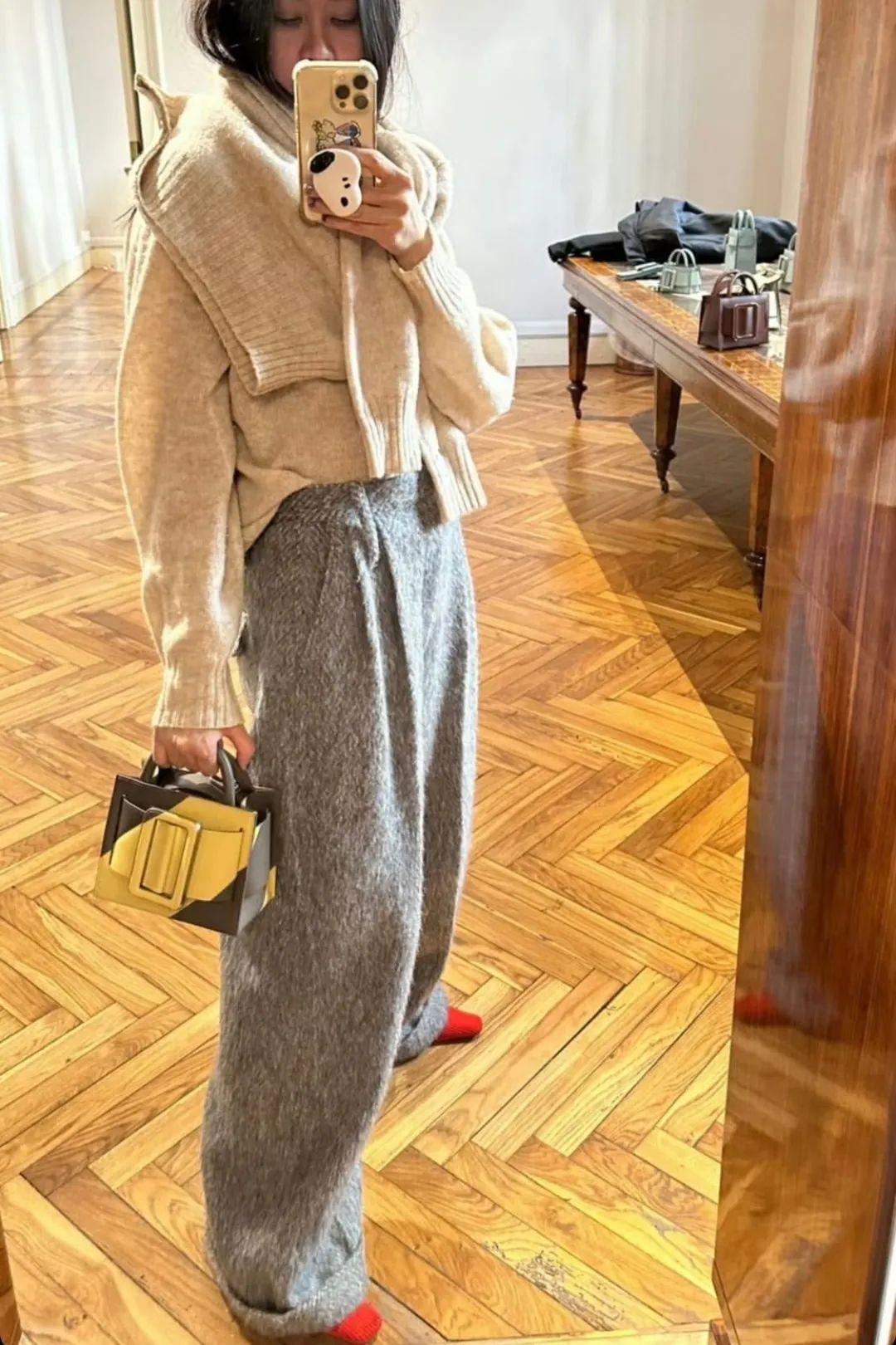 当然一件红色毛衣是离不开的衣橱必备款,只不过在搭配上,今年的灰色系是爆款组合。