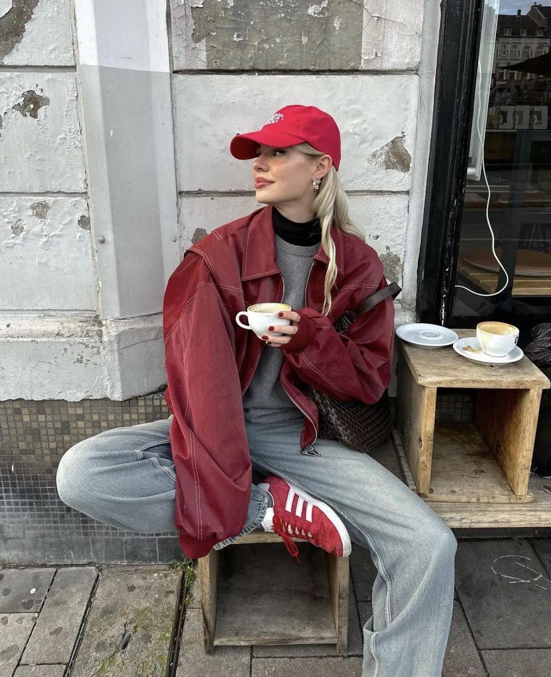 如果觉得70%的红色系穿搭太过了,也可以选择50%这样一个较为均衡的比例,比如一件短款红色外套,下装随便一条牛仔裤就足够和谐时髦。