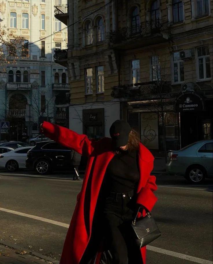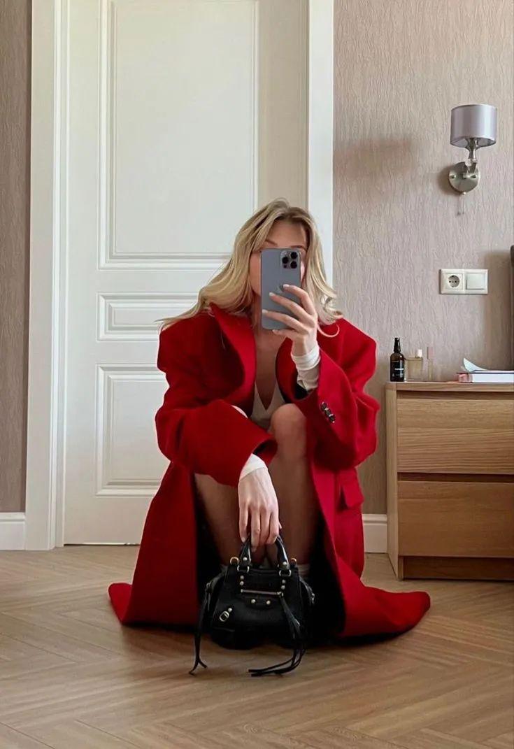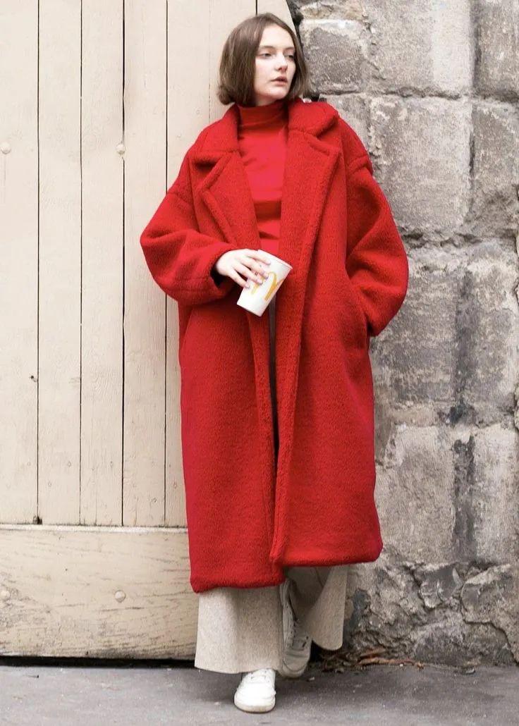 在搭配上,内搭黑白是首选,黑色可以降低红色的亮度,增加明度,看起来红得更加深邃。