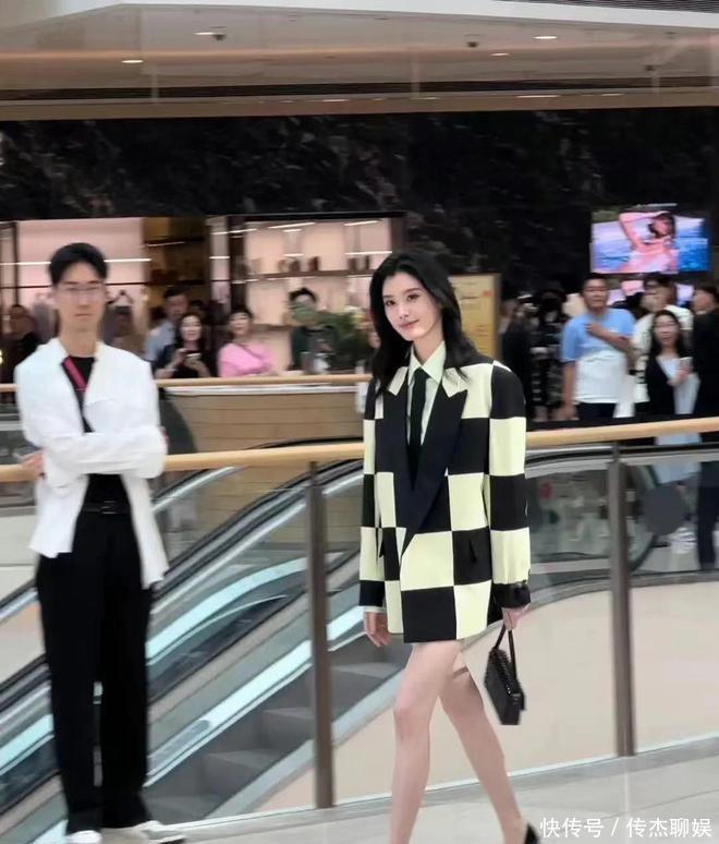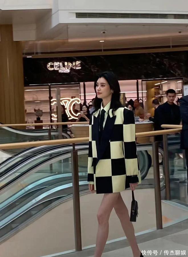 像奚梦瑶这款黑白大格纹元素的西服就偏冷冽大气风很多,内里加上衬衫领带式的搭配,不仅穿出了西服的沉稳与霸气,美腿+高跟鞋的搭配还尤为性感。