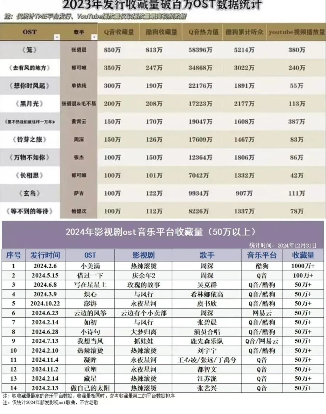 在它之后的OST,数据直接断崖式下跌,平台收藏量基本只有50万,跟2023年的相差甚远。