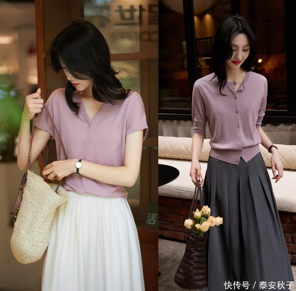 比如上面图中的它,选用了春末夏初时分最为经典、实穿的开衫单品,释放出成熟女性温柔似水的韵味。