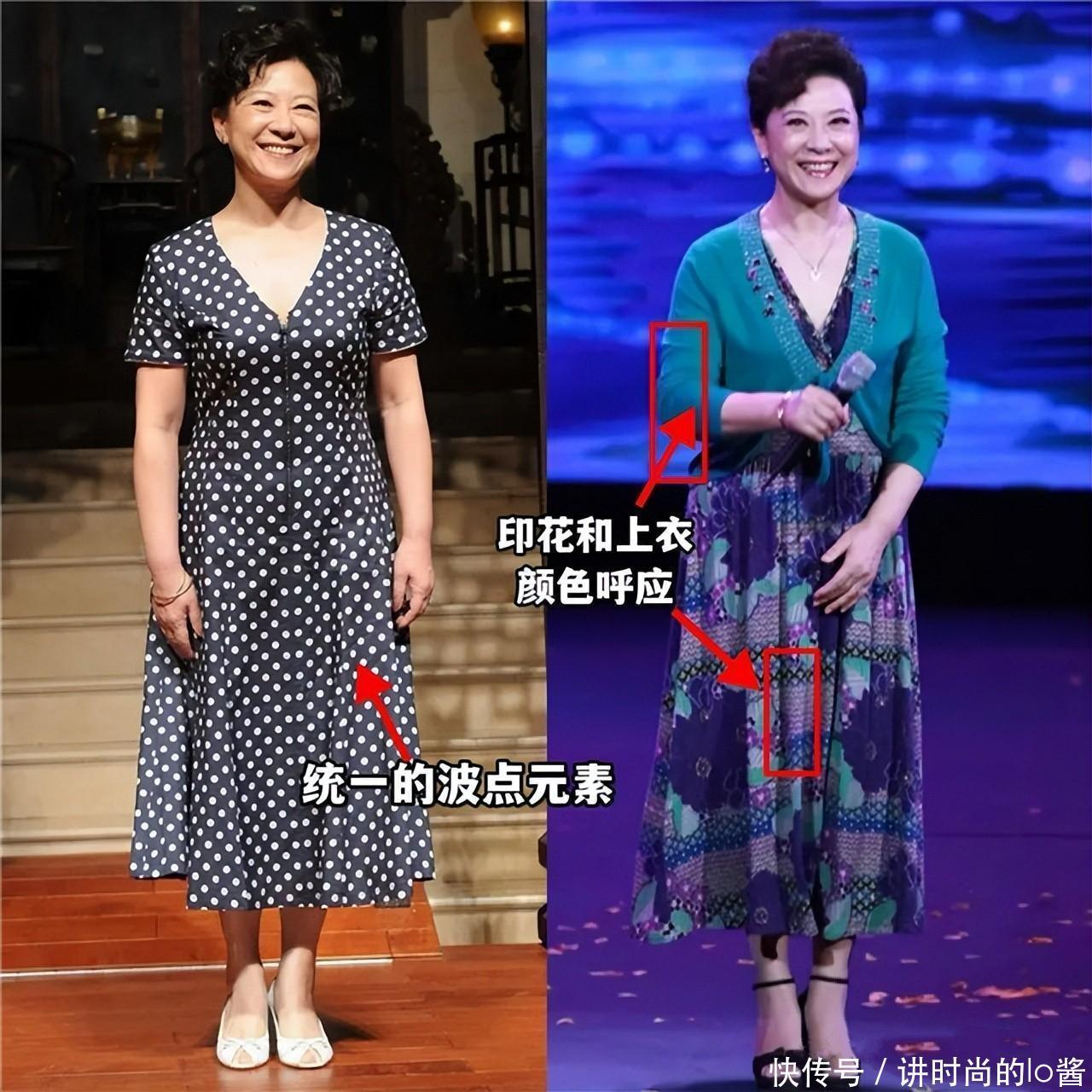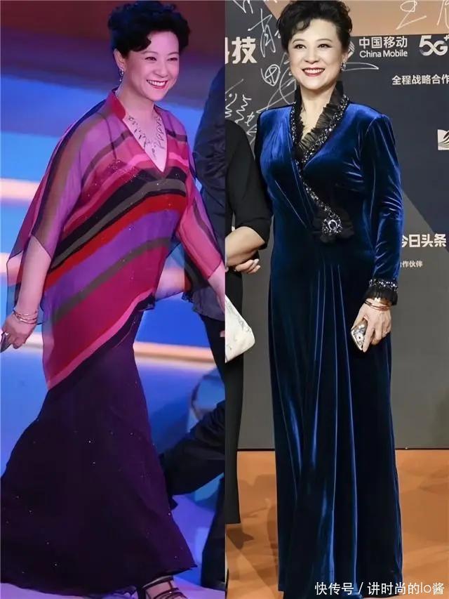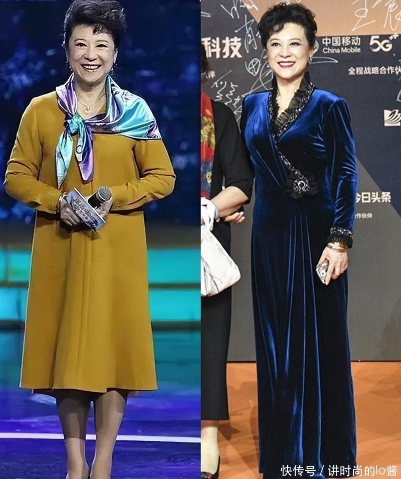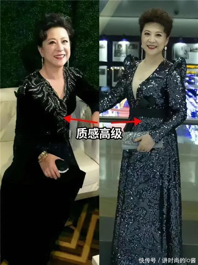 更建议中老年女性多尝试质感高级且垂感比较强的长裙,像王馥荔老师所选的这一种,加入了“亮片元素”且垂感强的长裙,就能打造出精致贵气的风格。