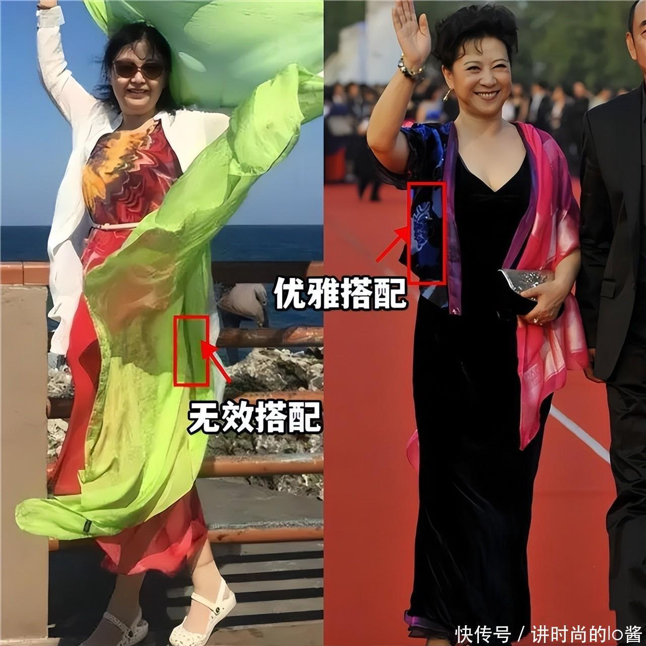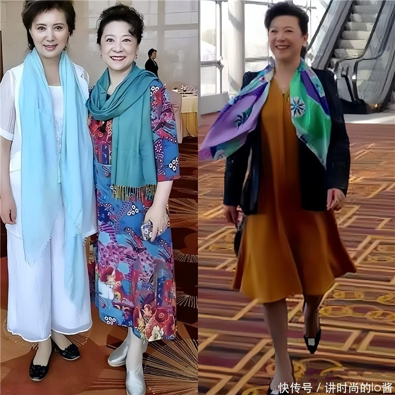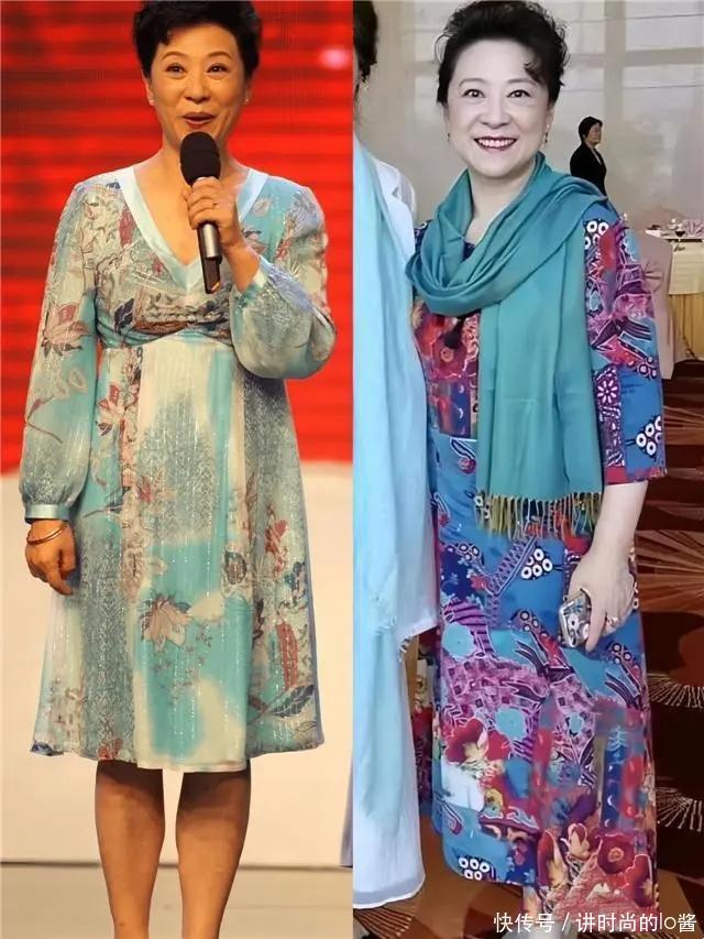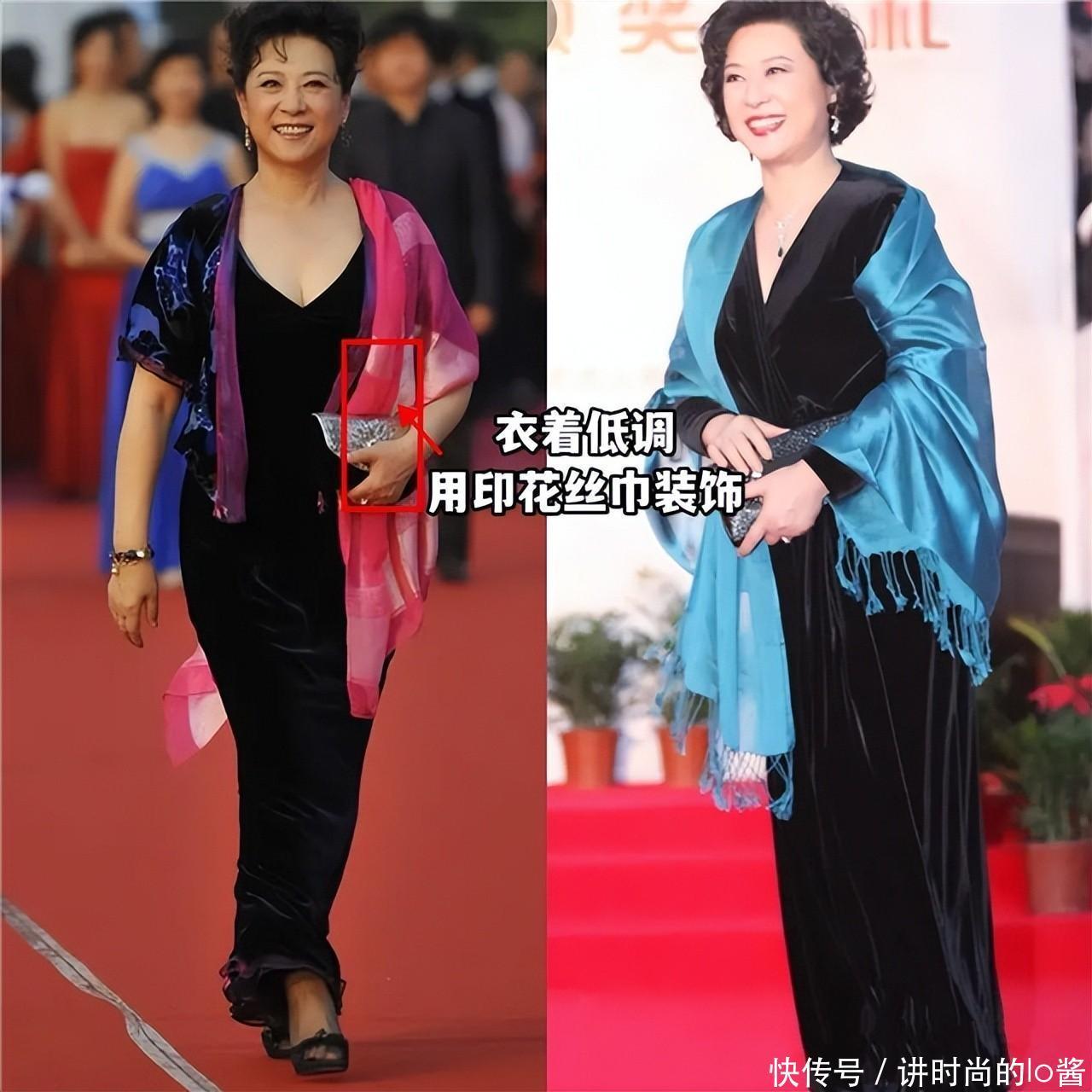 更建议中老年女性多尝试质感高级且垂感比较强的长裙,像王馥荔老师所选的这一种,加入了“亮片元素”且垂感强的长裙,就能打造出精致贵气的风格。