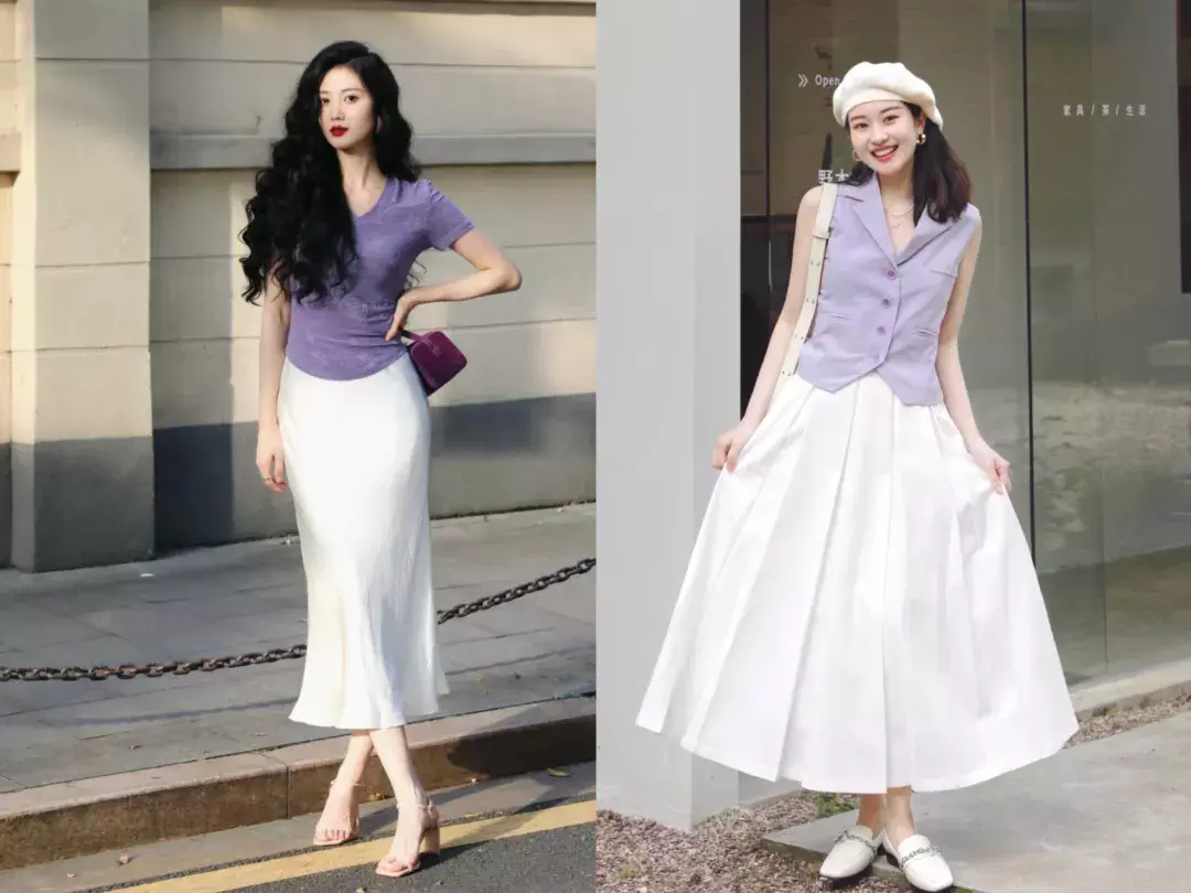 二、色彩搭配1、紫色与中性色的搭配紫色和黑色、白色或灰色的搭配是最不会出错的选择。这样的搭配不仅能突出紫色的高级感,同时也能保持整体穿搭的平衡。我们可以选择一条紫色上衣搭配一件白色长裙,既清新又不失优雅。