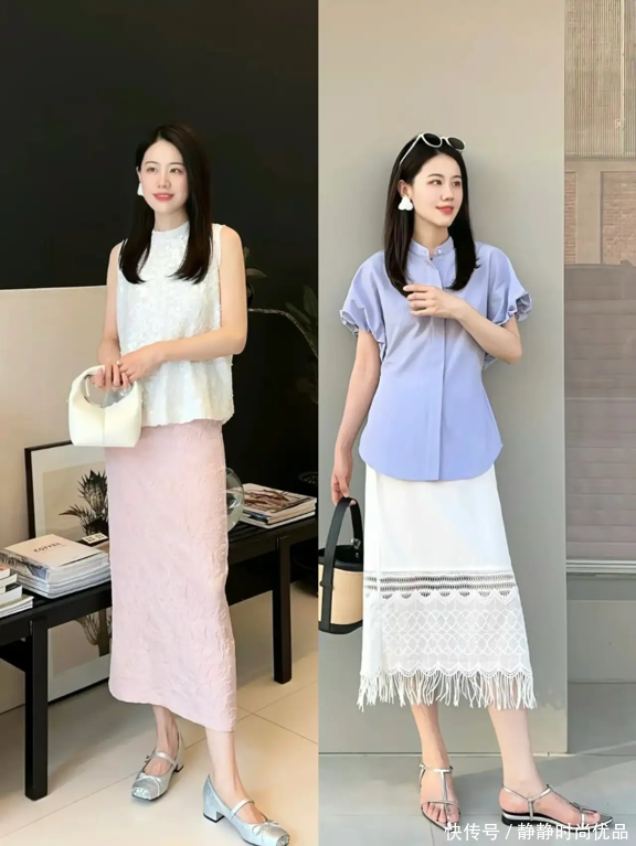 像这种修身的马甲或者是T恤也很适合搭配半身裙,这样搭配的目的就在于突出我们的腰线比例,打造出苗条的身材。