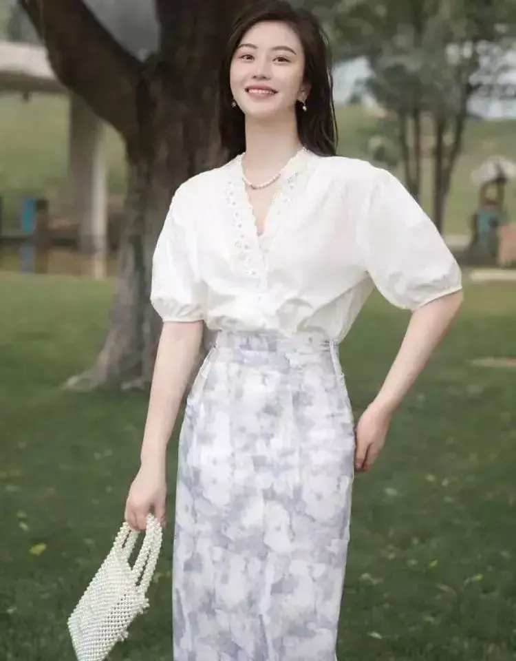 这也是我们常见的一种穿衣技巧,上简下繁能让你的造型不单调,比如下面这位素人博主选择的泡泡袖的短袖衬衫,上衣搭配上印花的半身裙,把繁琐印花的半身裙放在下半身,你的视觉重心就会往下移,看上去整个造型就不会繁琐凌乱。