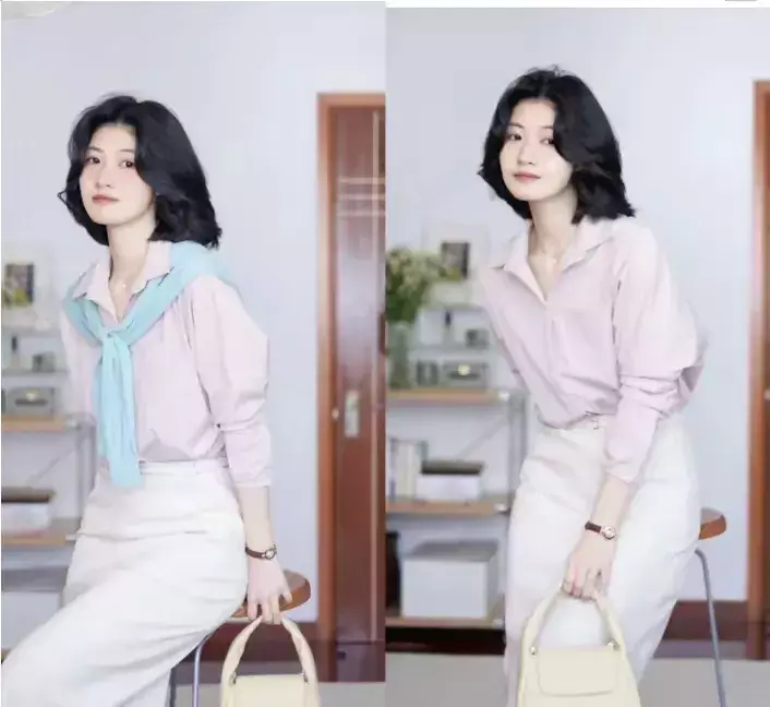 如果你保养的比较好的情况下,可以选择粉色的衬衫上衣搭配上米白色的包臀半身裙,在肩膀上搭上一款浅蓝色的针织上衣,在组合上一款微卷的波波头短发造型,这样的打扮将你的魅力全开。