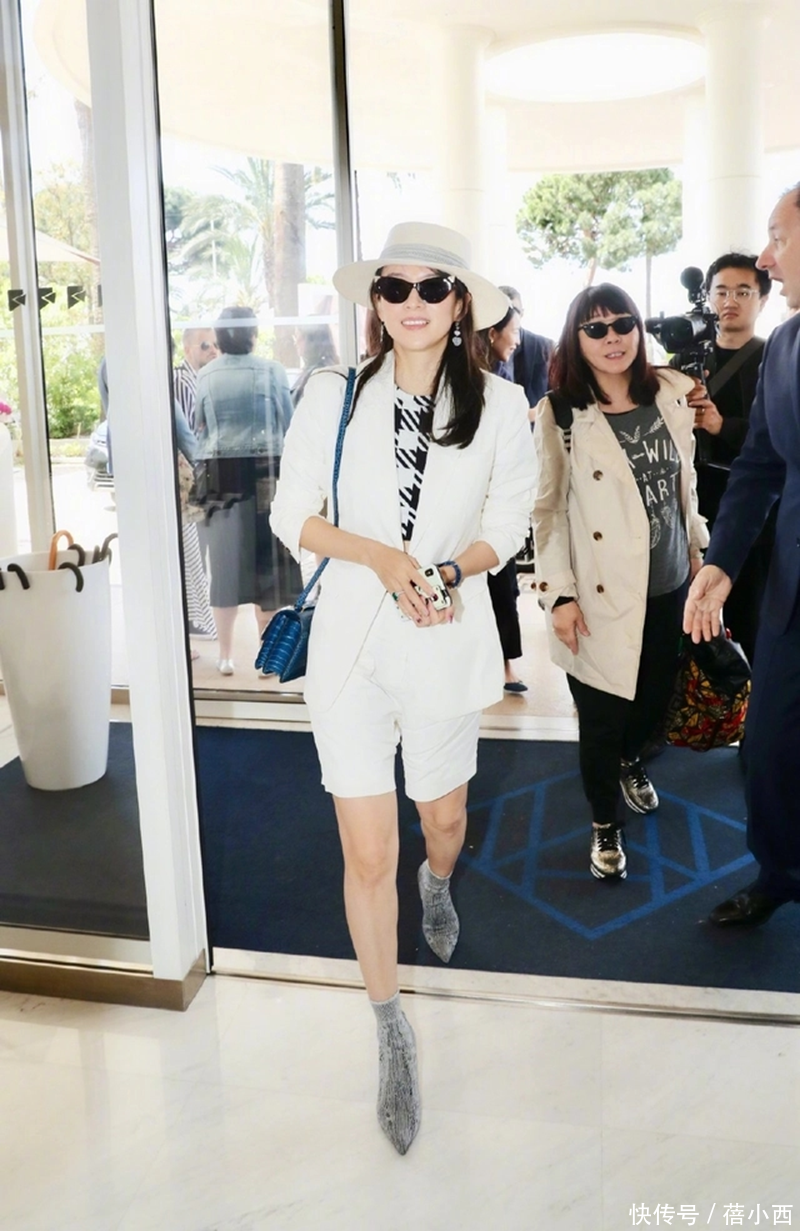 西装、短裤成套穿的最大优势在于没什么搭配难度,出错率低,好比章子怡这身白色西装搭配白色短裤,干练利落又显气质。
