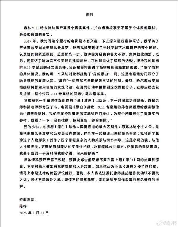 23日上午,编剧陈枰发布第三份回应声明,称其2017年采访了吉林市公安局原刑警队长袁韧和刑满释放的杨树彬弟弟,了解当时的具体情况,“我的每一个采访对象都提到了‘身份漂白’一词,这是专案组对犯罪分子隐身特征的显著认知。‘漂白’一词当然不是前记者王猛的独创。”