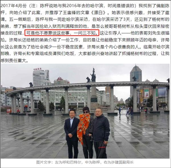 2.陈枰在哈尔滨采风期间,见到了专案组成员以及罪犯杨树彬的弟弟(陈枰在声明中有提及,意在称自己是通过采访获取的一手资料,并非搬运报道细节),但杨树彬的弟弟当时在陈枰面前“不愿意谈这些事,一问三不知”。