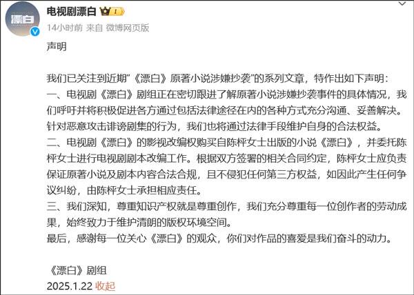 1月22日晚,《漂白》剧方首次就“涉嫌抄袭”一事发声,称该剧影视改编权购买自陈枰出版的小说《漂白》,并委托陈枰进行电视剧剧本改编工作,“如因此产生任何争议纠纷,由陈枰女士承担相应责任”。