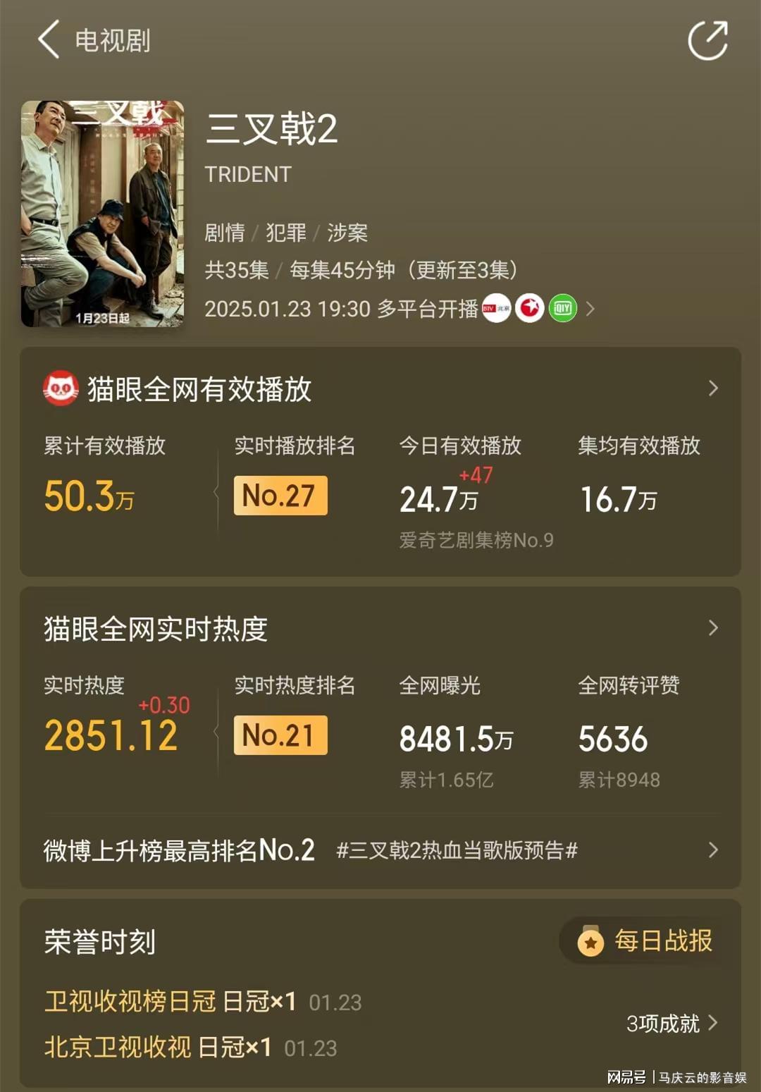 和大面积差评一同出现的,则是这部电视剧的网播数字,也非常难看。一般的电视剧,上线首日,热度至少能够进入前排,播放数字,也至少是几百万起步的。这部《三叉戟2》在网络热度和播放数字上,出现了双输的局面。显然,观众们知道什么是好电视剧,什么是烂电视剧。截至目前,该剧累计播放只有50.3万,实时热度排名是第21位,集均有效播放只有16.7万。