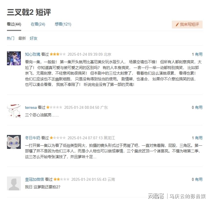 《三叉戟2》在豆瓣上,出现了大面积的差评。有观众认为,这部电视剧爹味十足,也有观众认为,这部电视剧搞笑内容更像是闹剧,更是有观众批评,这部电视剧典型的男凝,比基尼段落,跟烂俗的网络电影没啥区别,同时,有观众指出,这三位主演的表演非常尴尬,并不好笑等等。