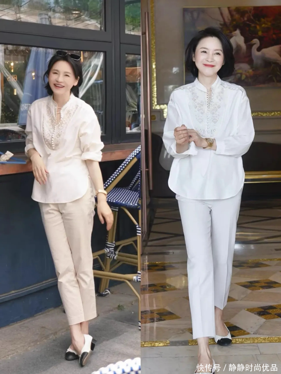 纯白色的衬衫穿在身上温柔又大方,尤其是年龄大的女人穿,更是会显得很优雅。