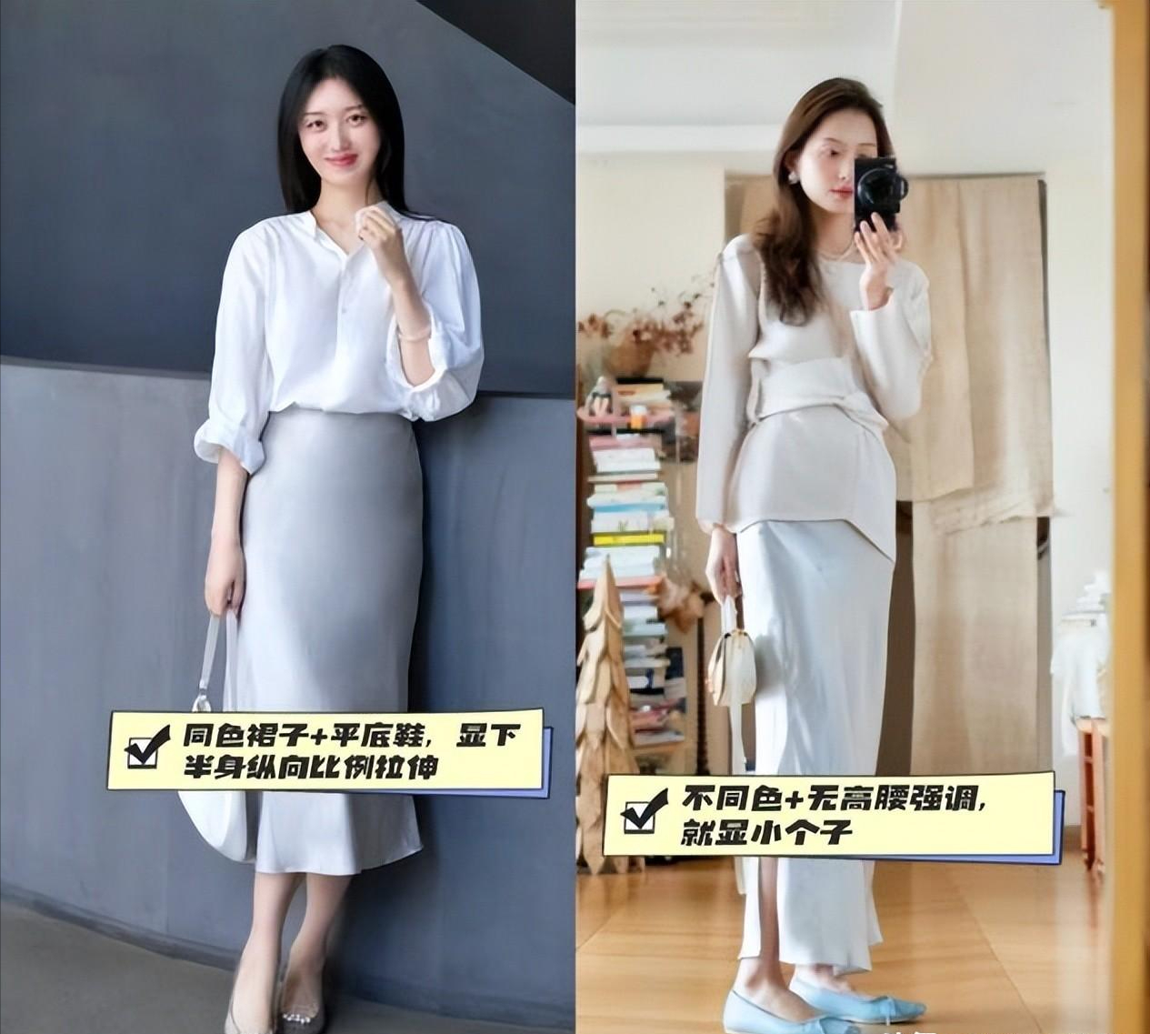 比如像下面这一件白色衬衫加上灰色鱼尾裙,脚上踩着同色系列的平底鞋,显得下半身比例更加拉长一些,再把白色衬衫塞进半身裙里面,三七分的身材比例不就出来了。