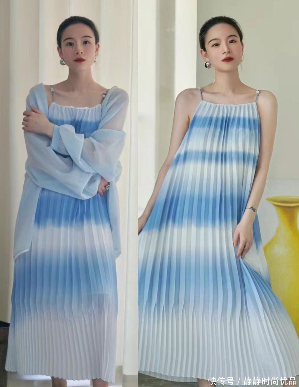 丝绸材质的长裙,面料看上去相当之丝滑贵气,再结合上浅蓝色的配色,也能更快速的释放出柔和淡雅的魅力,非常显白显气质。