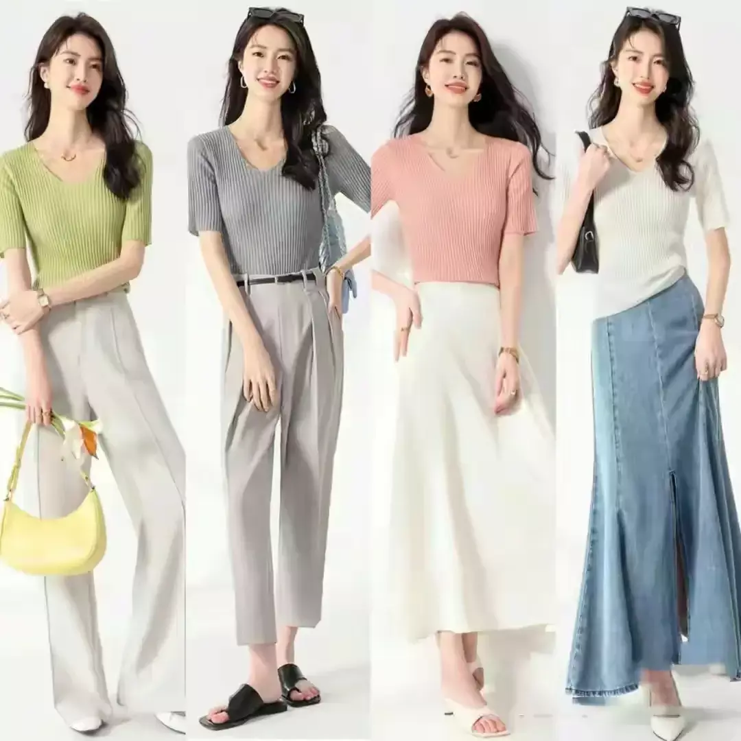 例如下面这四套穿衣示范,分别是浅绿色针织短袖,粉色,灰色,白色等,这样的衣服颜色搭配让你显白又显嫩,不管是和西裤还是半身裙组合搭配,都很适合正式的职场环境穿搭,同时又不会过于死板。