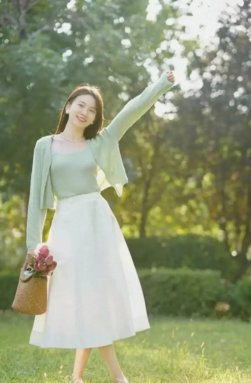 例如像下面这一套绿色的针织开衫,搭配上白色的伞状半身裙,这样的穿搭造型,谁能拒绝的了?