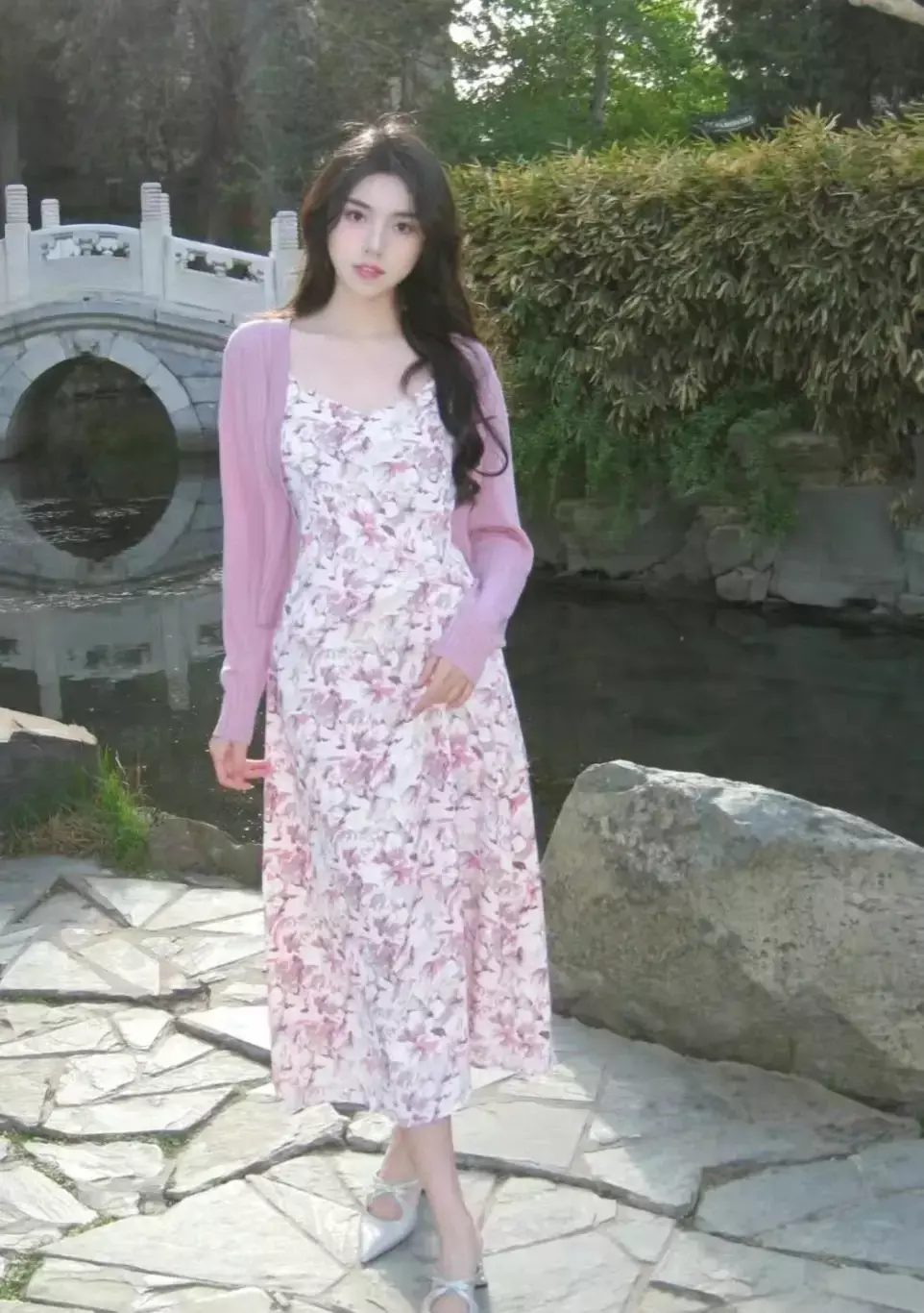 ①、粉色针织开衫搭配碎花连衣裙