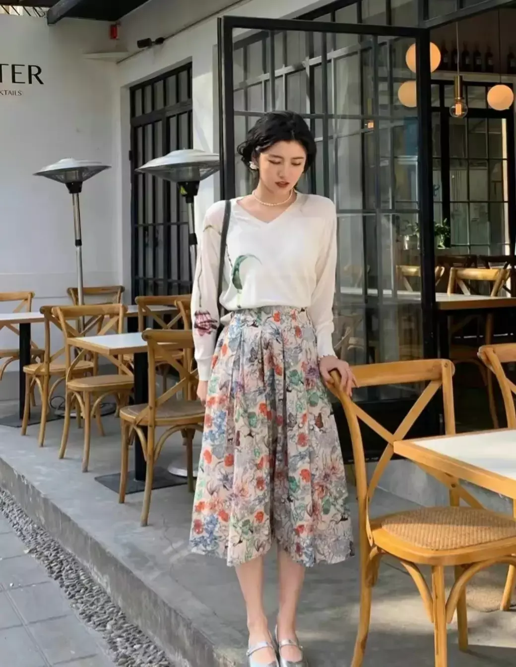 当然,针织衫也不一定说全是纯色系列的,像下面这一件V领的针织上衣也做了图案的设计,不过不会太过于花哨,和下半身的印花有着半身裙,就形成了一个鲜明的对比,自然整个重心就往下移了。